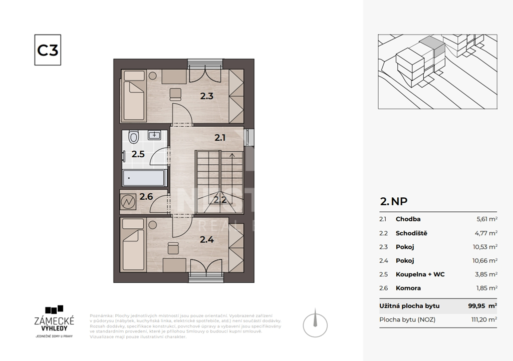 2. NP - ložnice (10,66 m2), ložnice (10,53 m2), koupelna + WC (3,85 m2), komora (1,85 m2), chodba (5,61 m2), schodiště (4,77 m2)