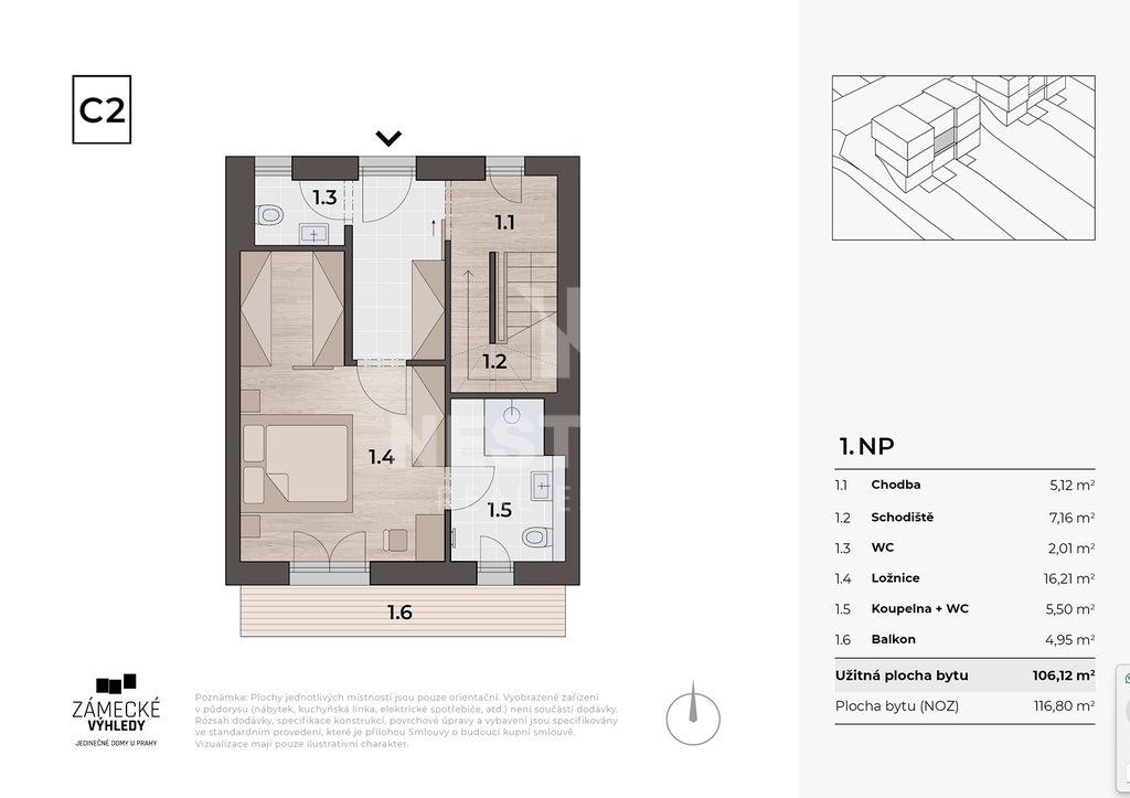 1. NP – ložnice (16,21 m2), koupelna + WC (5,50 m2), WC (2,01 m2), chodba (5,12 m2), schodiště (7,16 m2), balkon (4,95 m2)