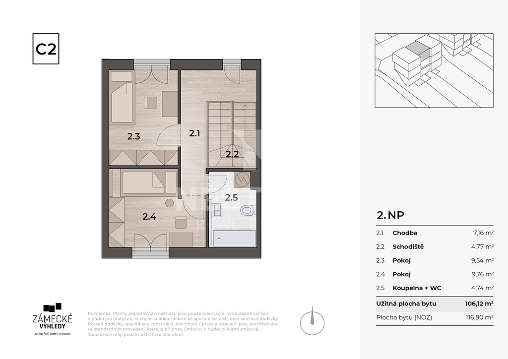 2. NP - pokoj (9,54 m2), pokoj (9,76 m2), koupelna + WC (4,74 m2), chodba (7,16 m2), schodiště (4,77 m2)