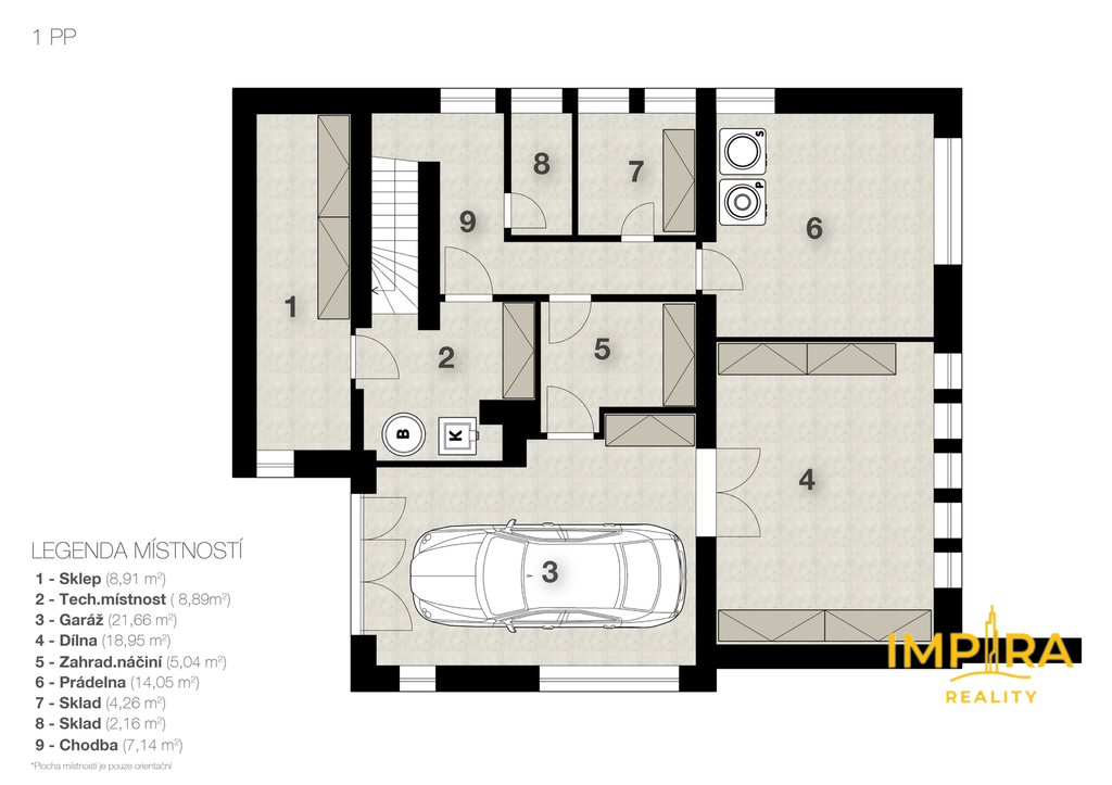Suterén (91 m²): Celopodsklepený dům nabízí garáž (22 m²), kotelnu, sklad, dílnu a prádelnu.