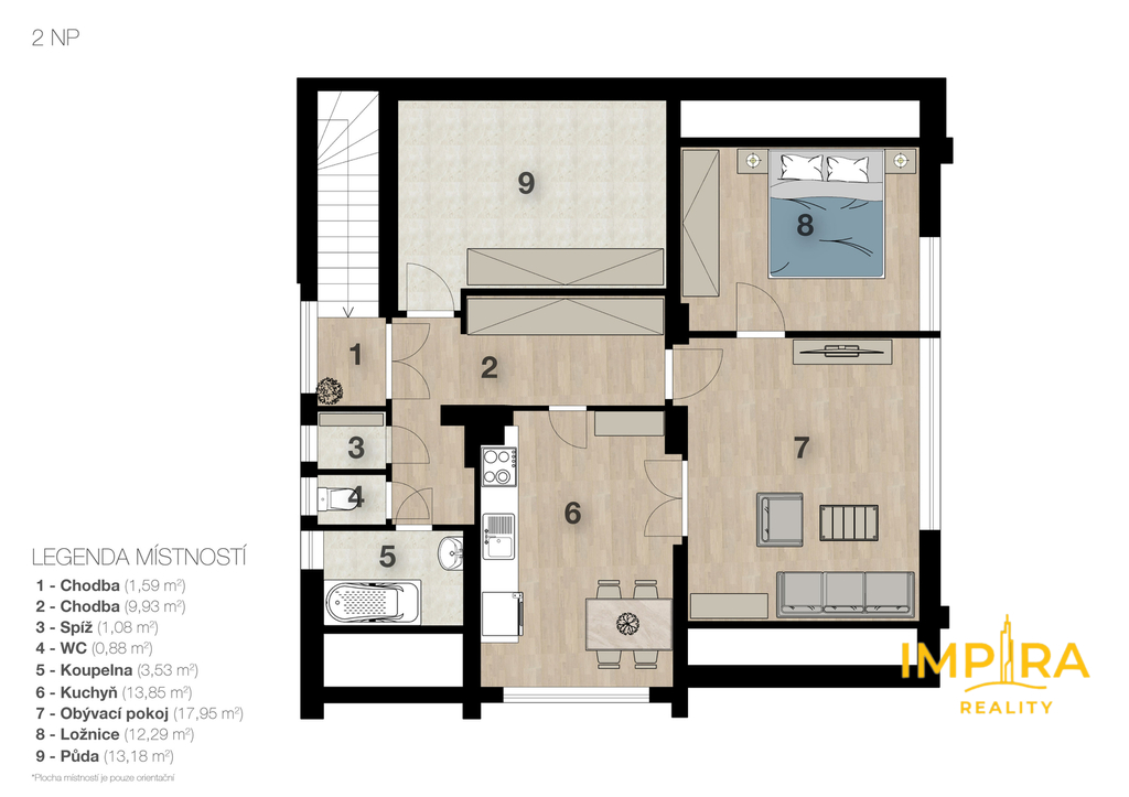 Podkroví (74 m²): Druhá bytová jednotka s možností dalšího dotvoření dle vlastních představ.