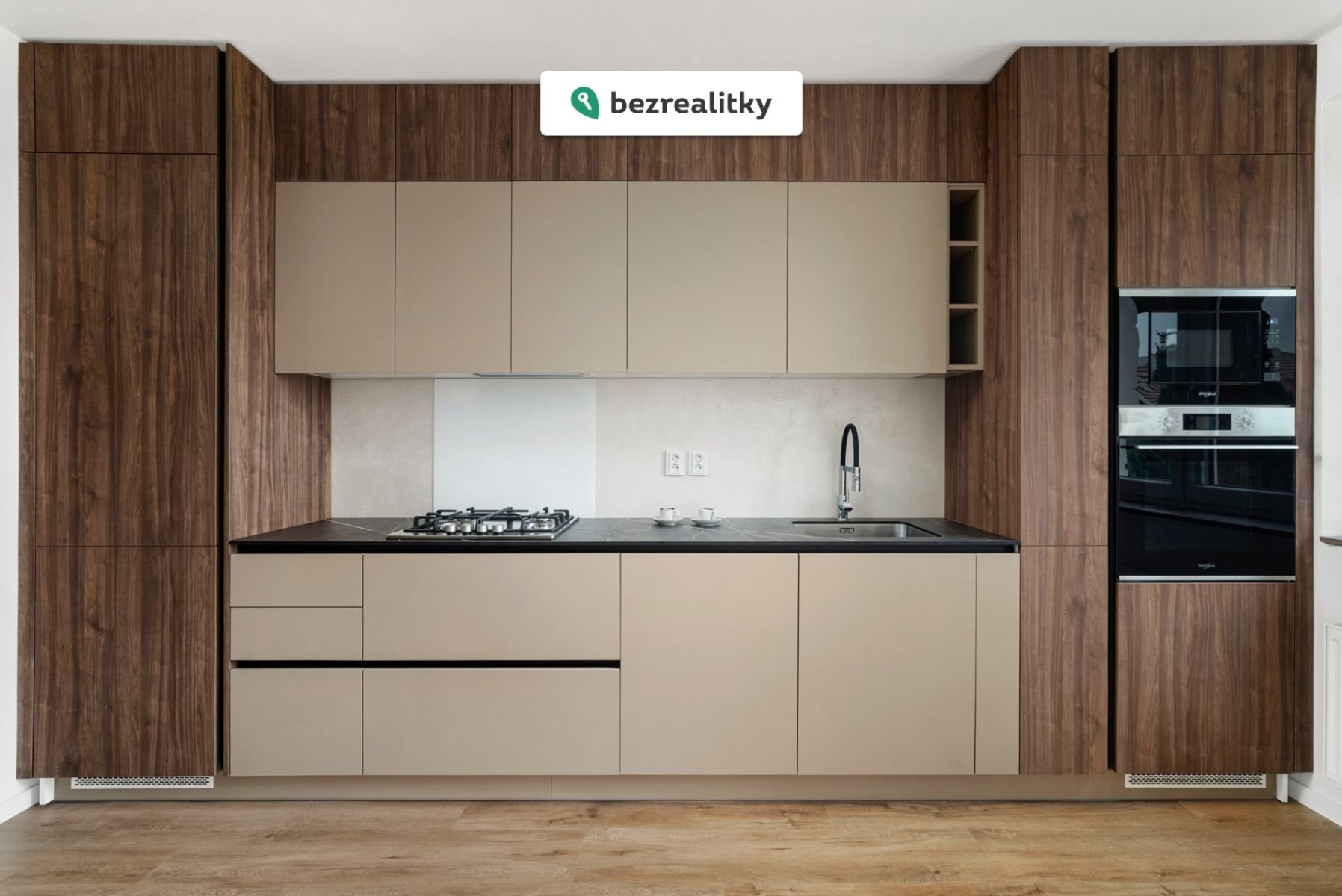 Srdcem bytu je luxusní kuchyňská linka na míru, vyrobená v moderní kombinaci matných povrchů a dekoru přírodního dřeva. V lince jsou instalovány značkové vestavné spotřebiče (lednice, plynová varná deska, mikrovlná trouba, myčka, elektrická trouba), samozřejmostí je dostatečný uložený prostor a automatické dorazy šuplíků a skříněk. V boční stěně je vsazena televize. Vše je sladěno do jednotného, elegantního stylu. Kuchyně plynule navazuje na obytnou část a vytváří reprezentativní prostor vhodný jak pro každodenní bydlení, tak pro setkání s přáteli. V koupelně a na WC byly instalovány napínané stropy s osvětlením, které vás nadchnou svým designem.