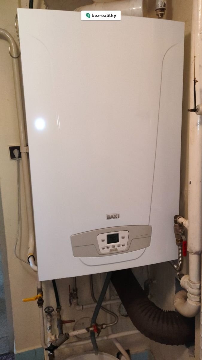 Topení a ohřev TUV zajišťuje plynový kotel BAXI se zásobníkem. Je plně funkční - stačí nastavit teplotu a dům je možno okamžitě obývat. (Sociální zázemí si samozřejmě rekonstrukci zaslouží.)