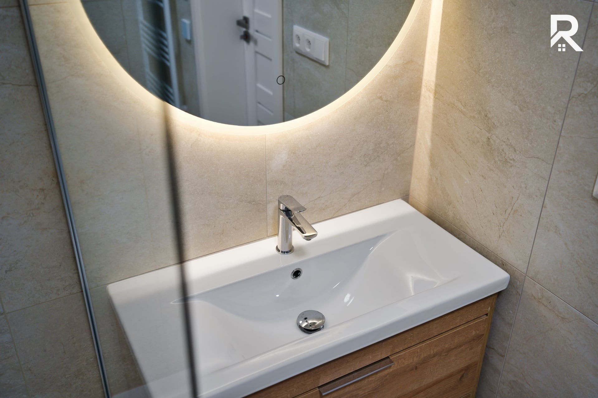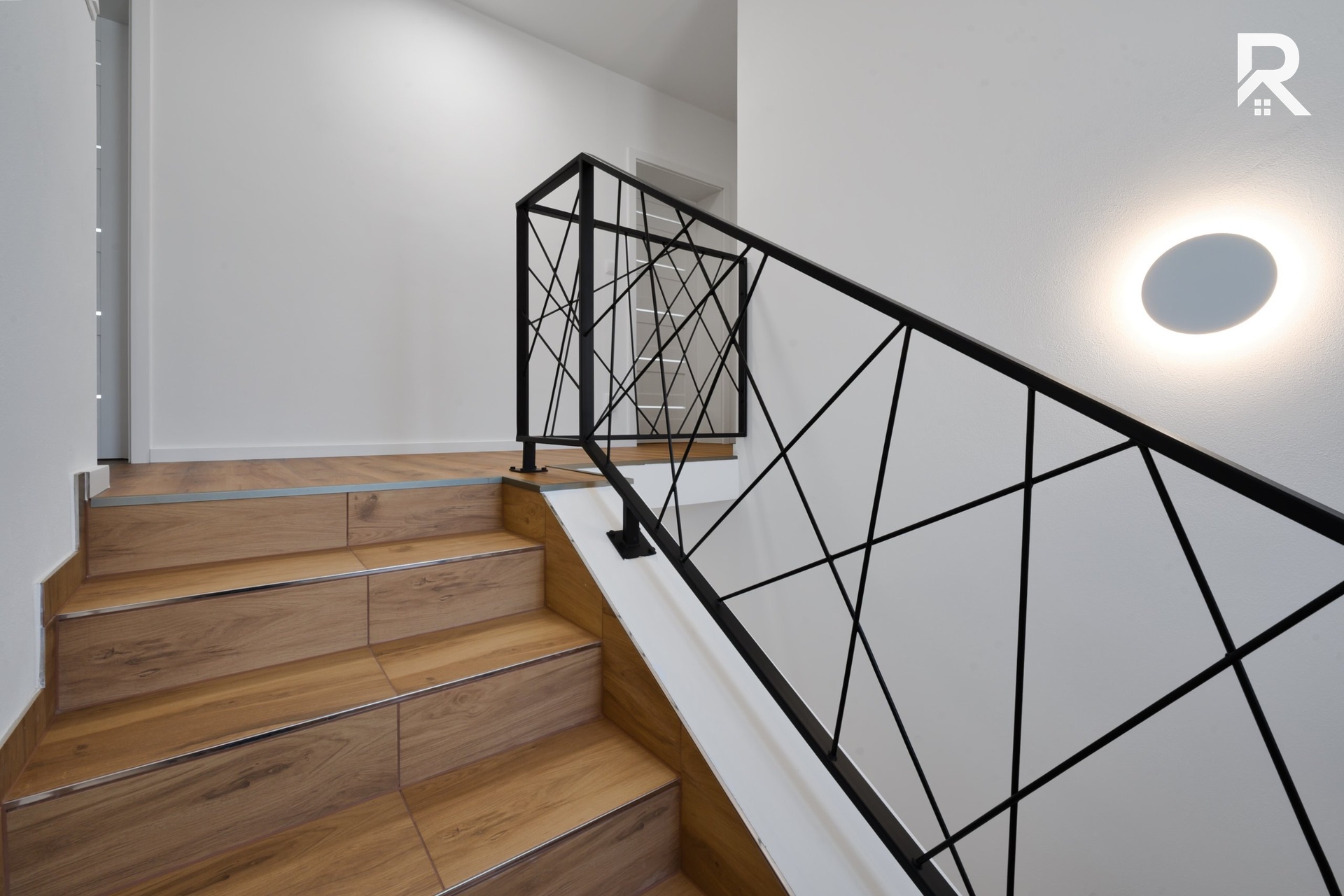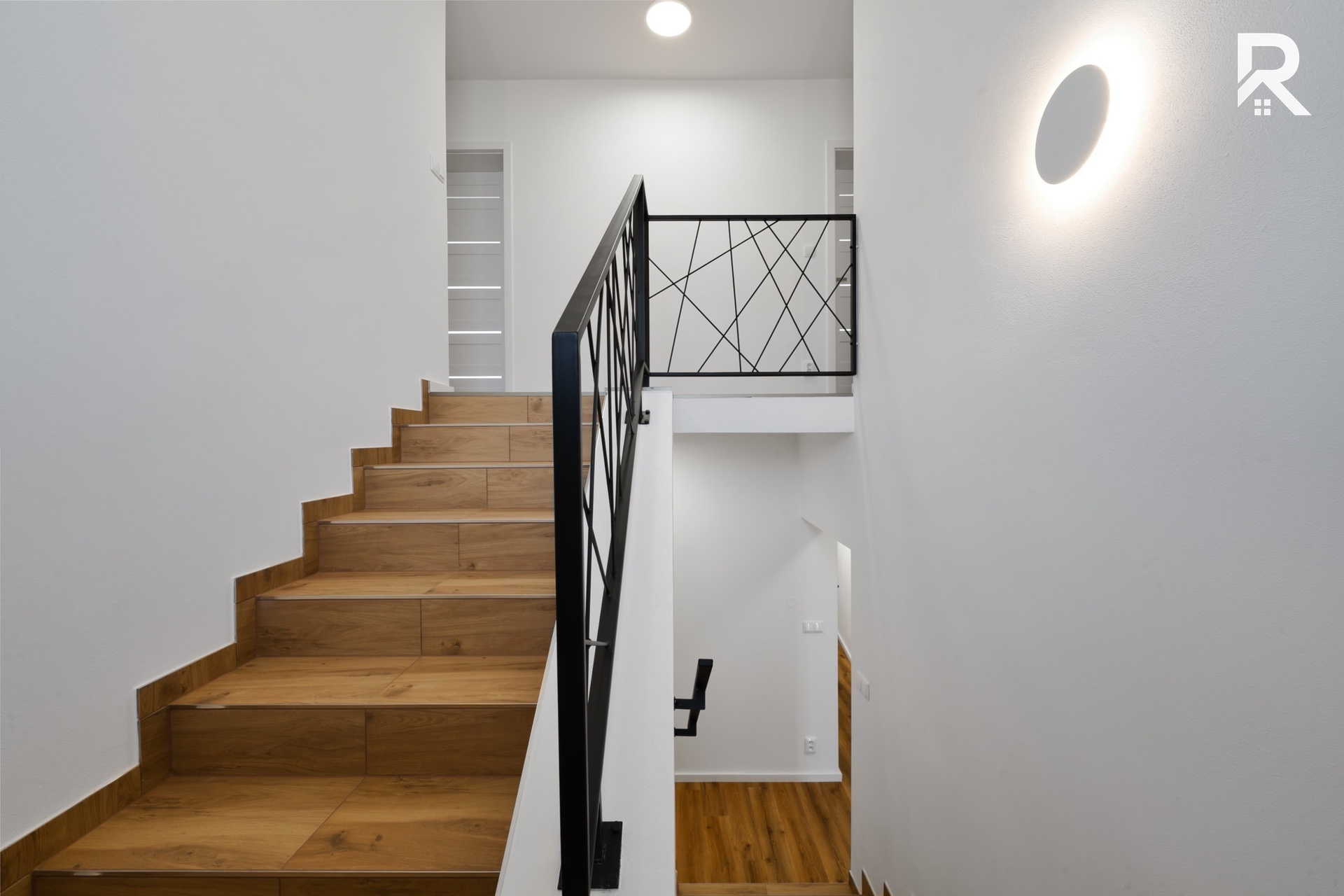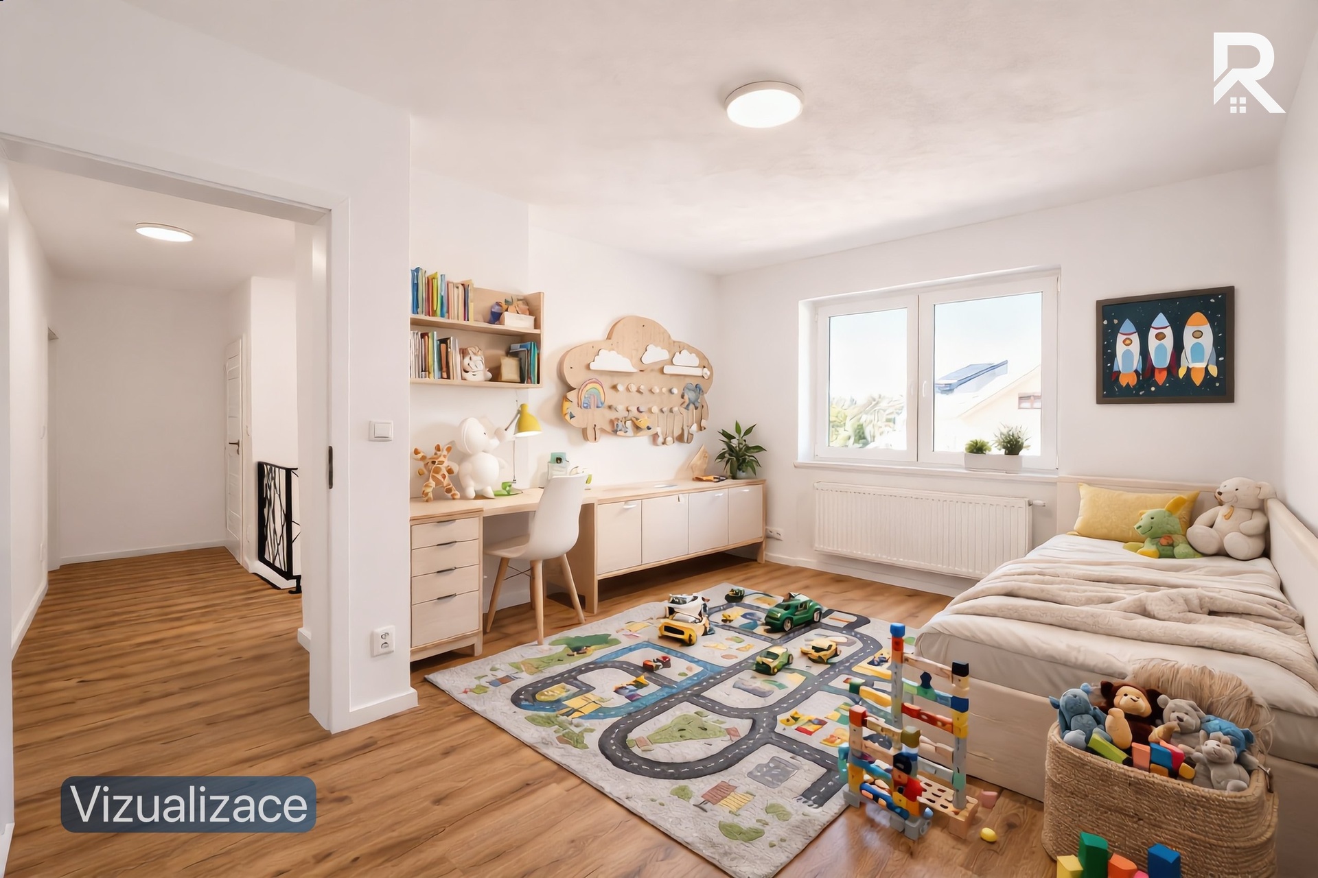 Dispozice domu je navržena s důrazem na praktičnost i pohodlí. V přízemí se nachází vstupní chodba, prostorný obývací pokoj s kuchyňským koutem, který je klimatizovaný, dále šatna či technická místnost, koupelna s vanou, přípravou na pračku a sušičku a samostatná toaleta. Koupelna je vybavena podlahovým vytápěním s vlastním termostatem a v obou koupelnách je instalováno čidlo pro cirkulaci teplé vody, což zvyšuje každodenní komfort. V patře jsou k dispozici tři samostatné, neprůchozí pokoje, které si můžete upravit dle vlastních představ a také druhá, prostorná koupelna se spádovým sprchovým koutem a podlahovým vytápěním.
