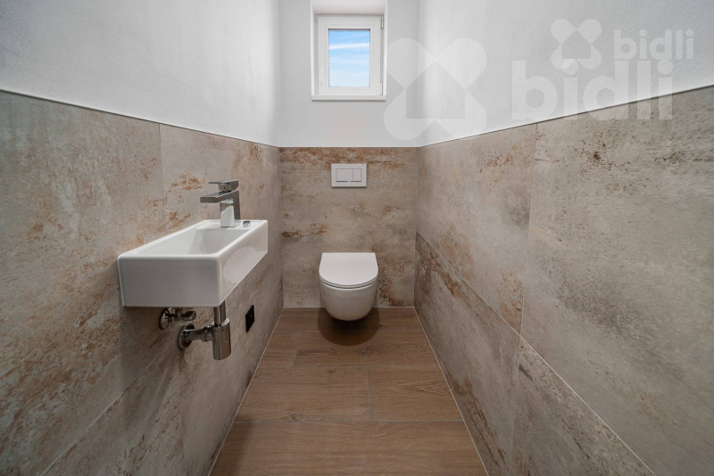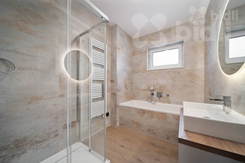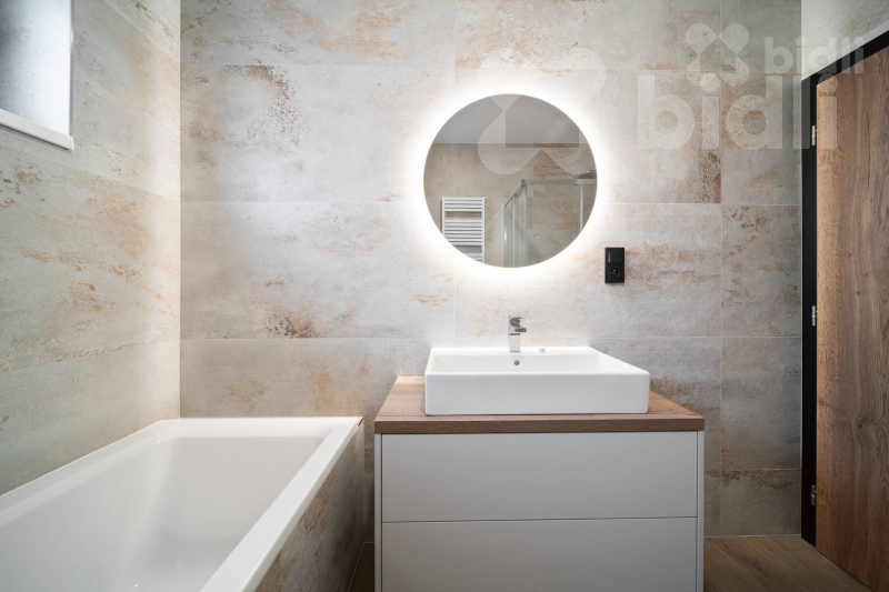 Koupelny jsou provedené ve vysokém standardu: velkoformátové obklady, podomítkové baterie Hansgrohe, keramika Ideal Standard / Vitra, skříňky na míru, zrcadla a elektrická otopná tělesa. Jedna koupelna nabízí sprchu i vanu, druhá nadstandardně velkou vanu + WC.