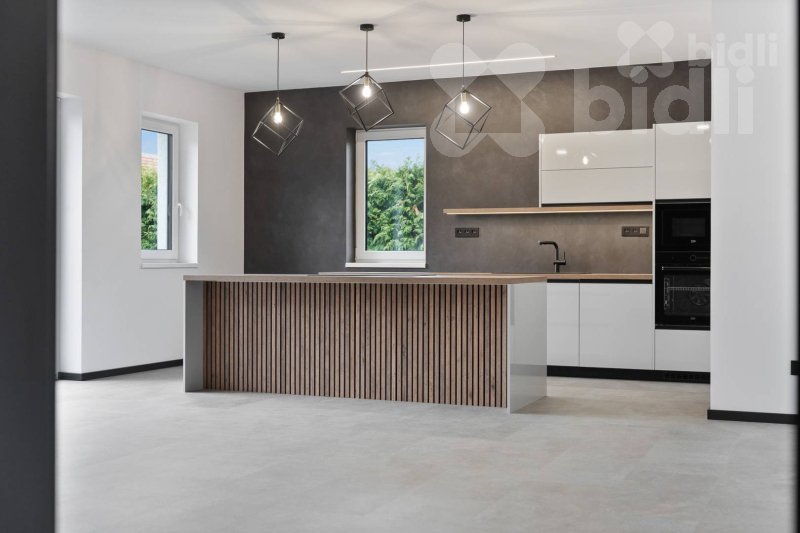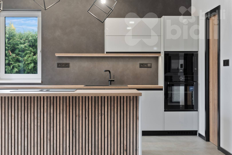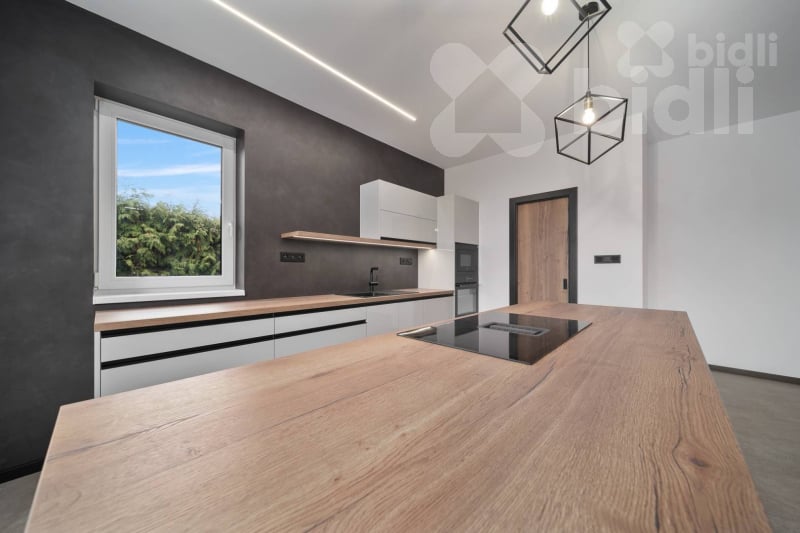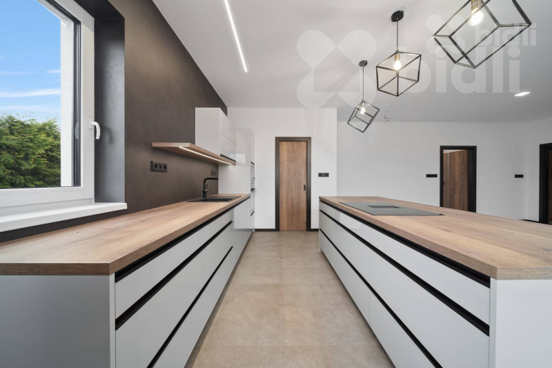 Kuchyňská linka je vyrobena na míru a osazena kvalitními spotřebiči (např. Franke - varná deska s integrovaným odsáváním). Velkou výhodou je samostatná spíž přístupná přímo z kuchyně.