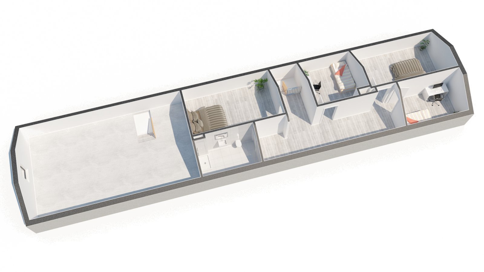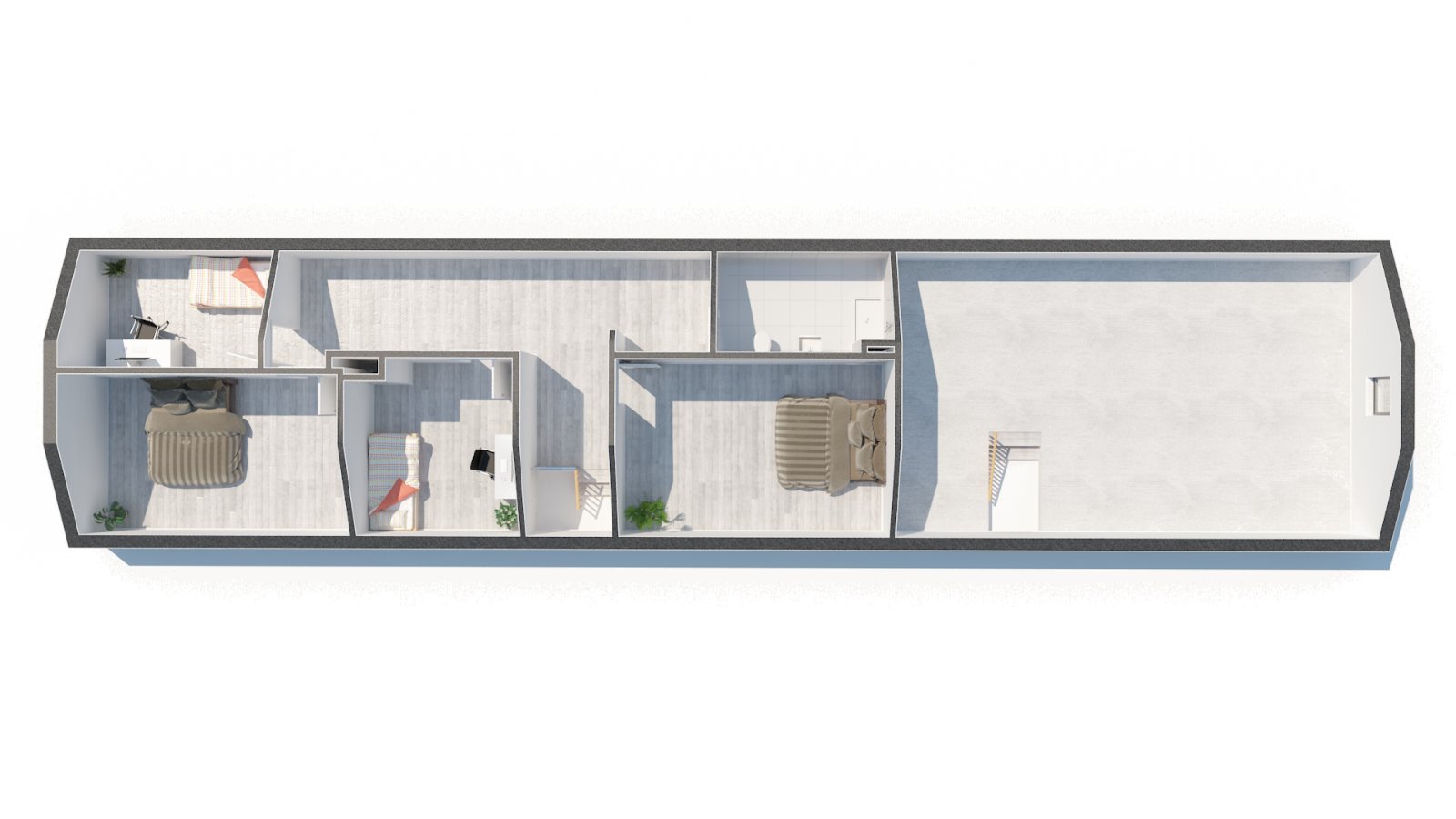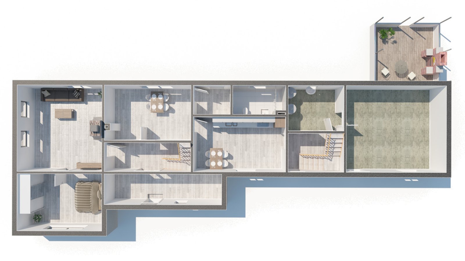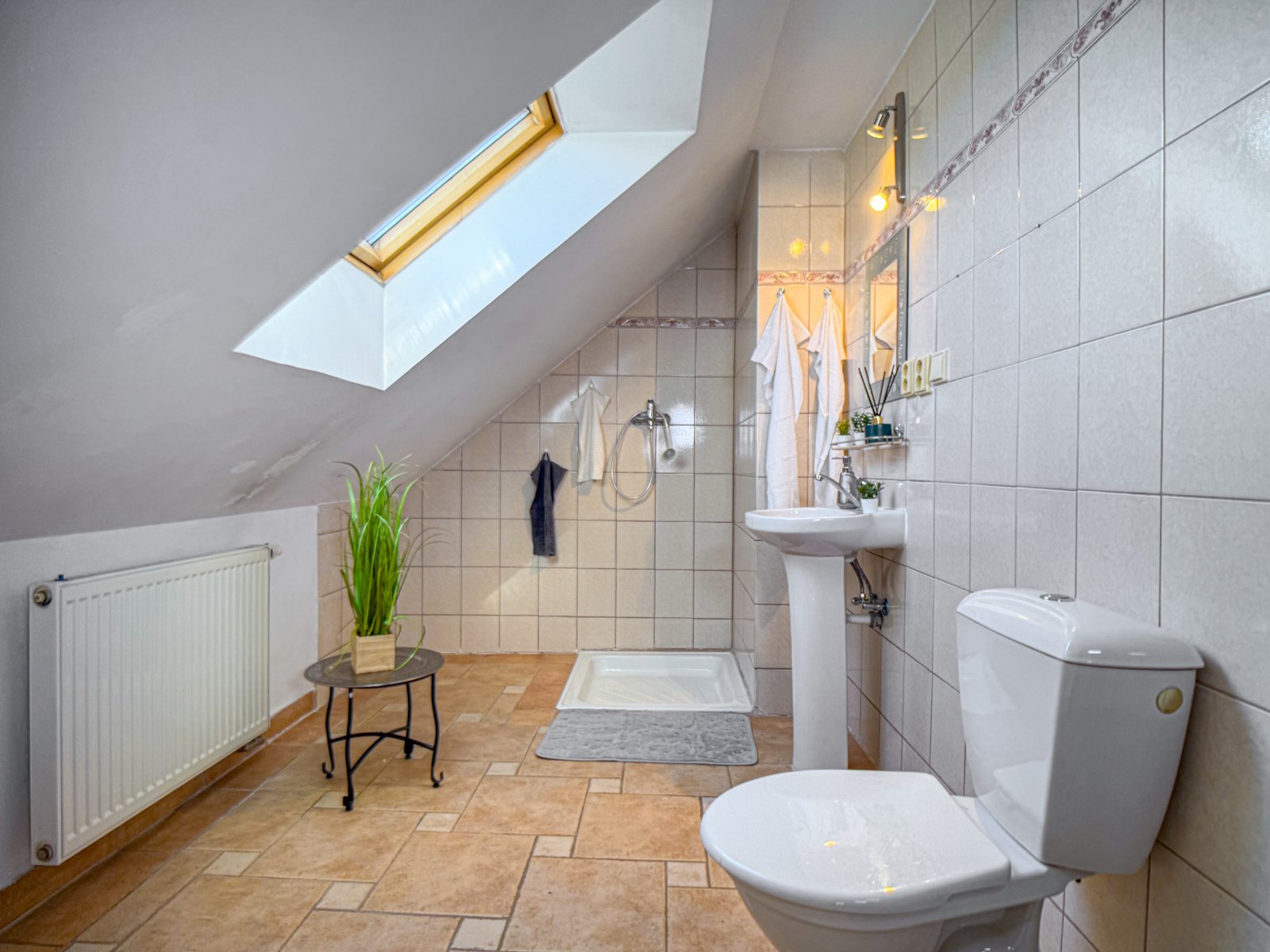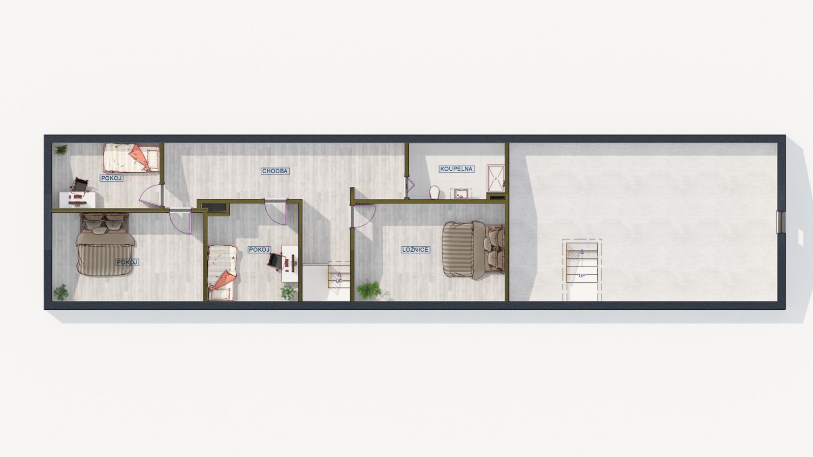 V patře jsou k dispozici 4 samostatné pokoje, prostorná chodba se vstupy do jednotlivých místností a koupelna se sprchovým koutem a toaletou. Velkým benefitem je také prostorná půda, která nabízí možnost vybudování dalších obytných místností dle vlastních představ.