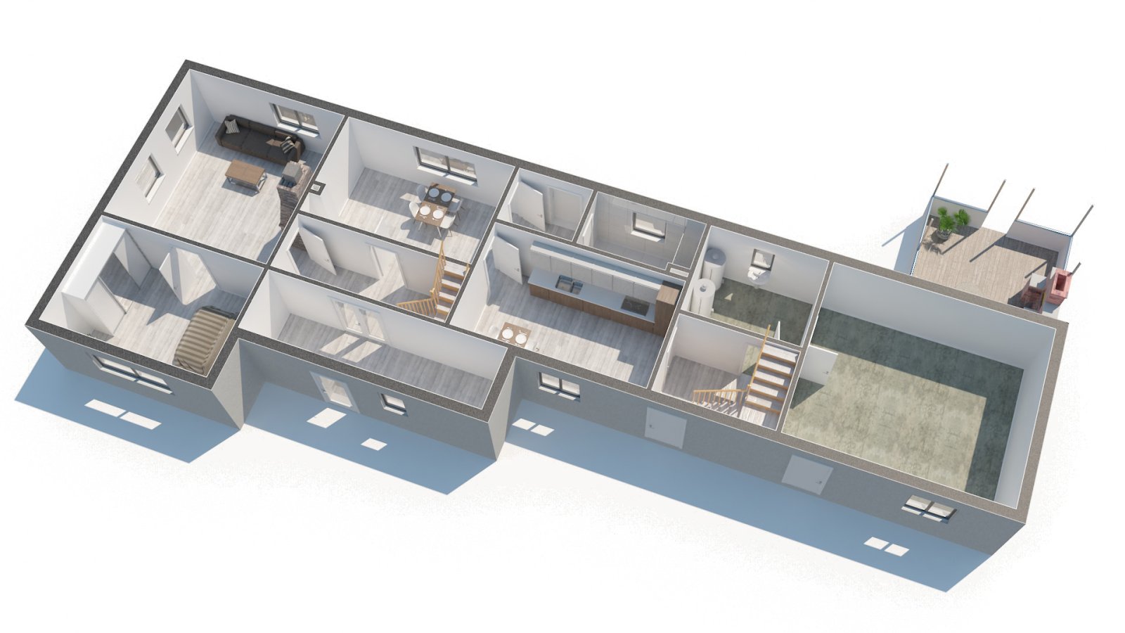 Do domu se vstupuje z uzavřeného dvora do předsíně, odkud pokračujete dále chodbou. Z chodby vede dřevěné schodiště do obytného podkroví. V přízemí se nachází kuchyně, samostatná jídelna, obývací pokoj, ložnice, koupelna s toaletou a druhý vstup, který vede přímo na zahradu.