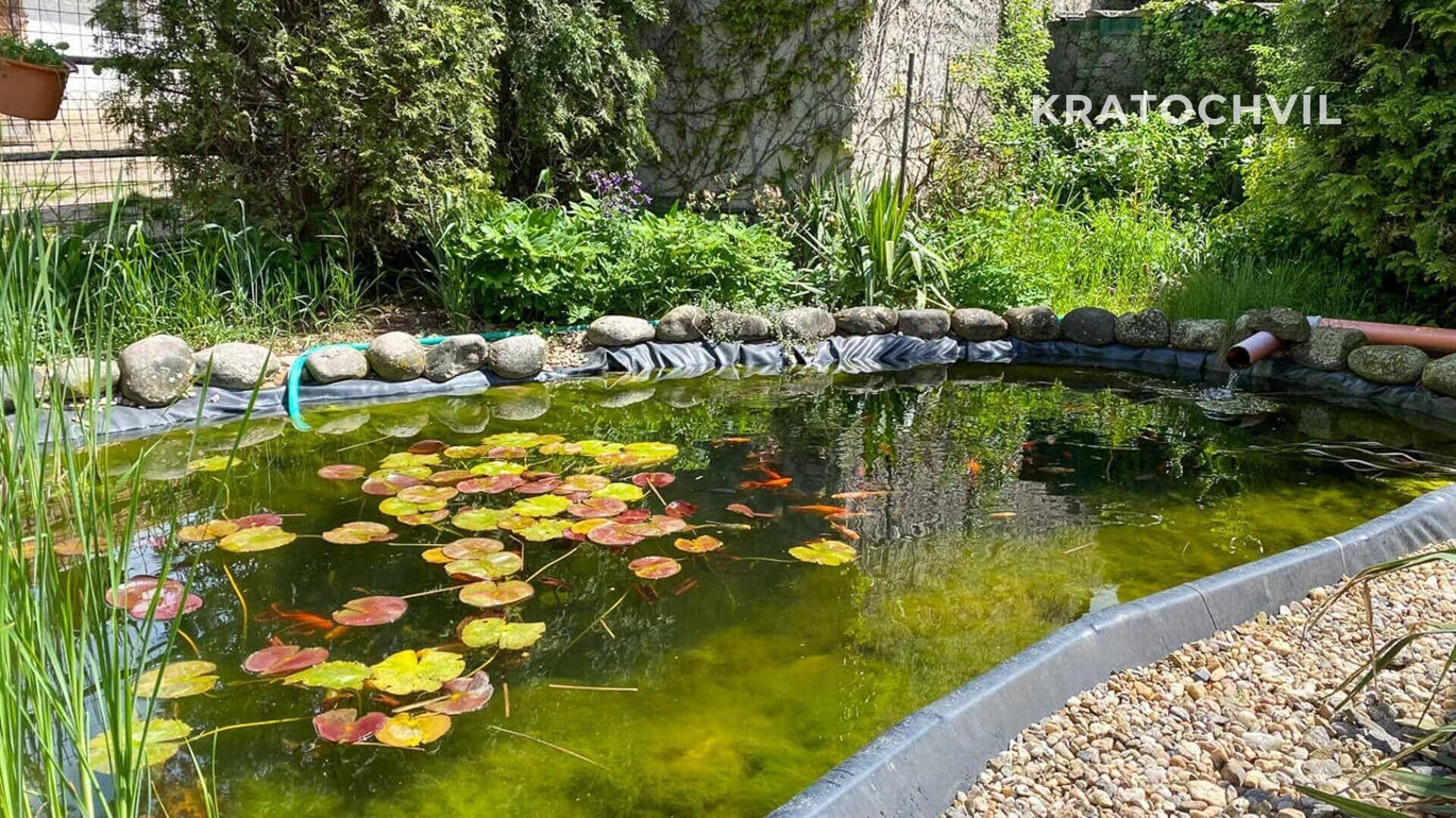 V přední části pozemku se nachází upravená zahrada se vzrostlými stromy, okrasnými keři a jezírkem, která zajišťuje soukromí a klidné zázemí.