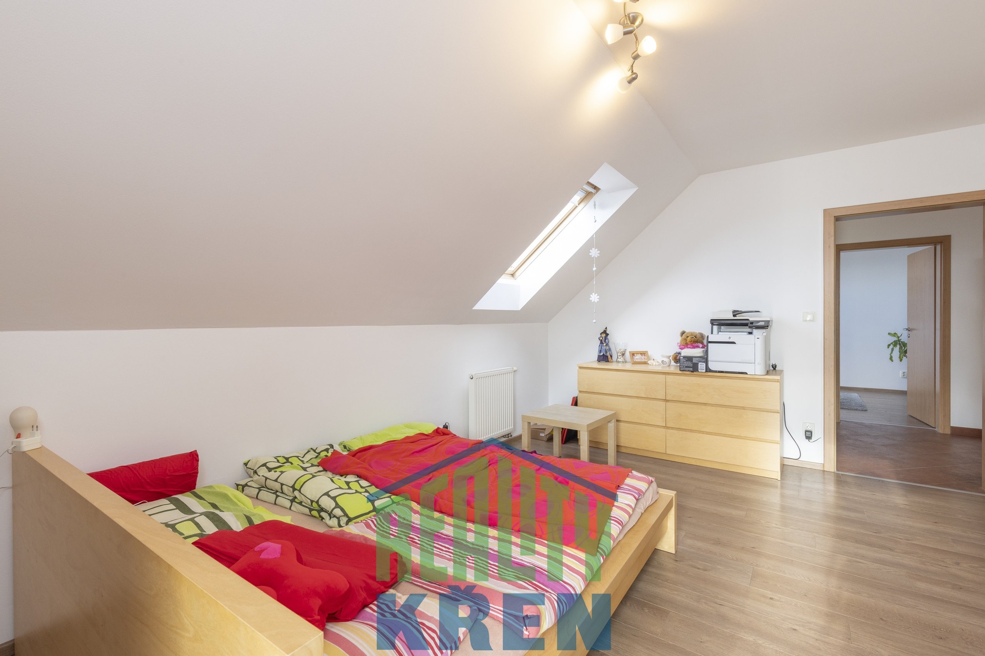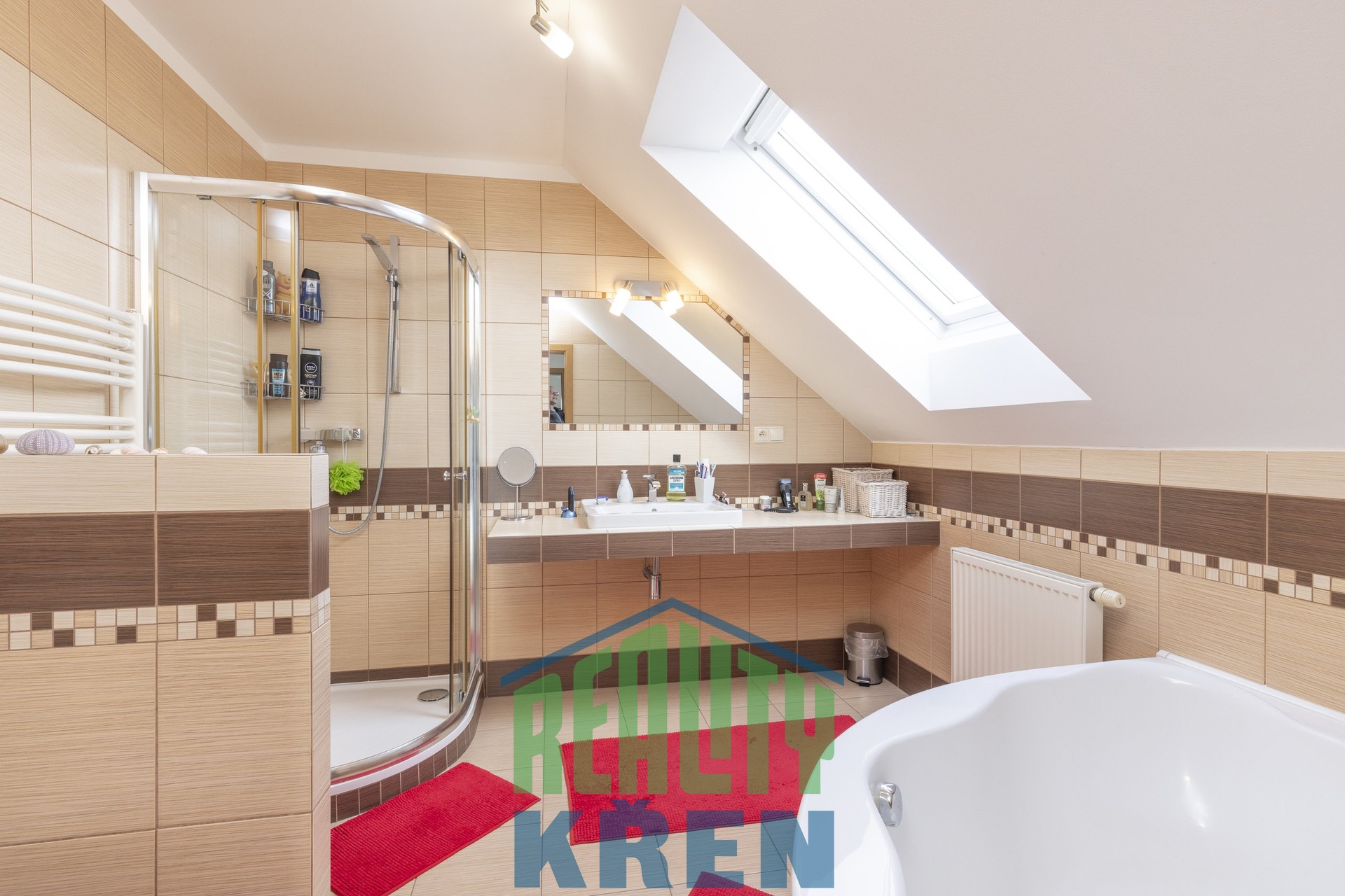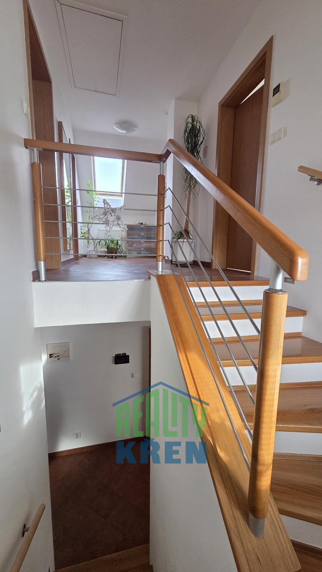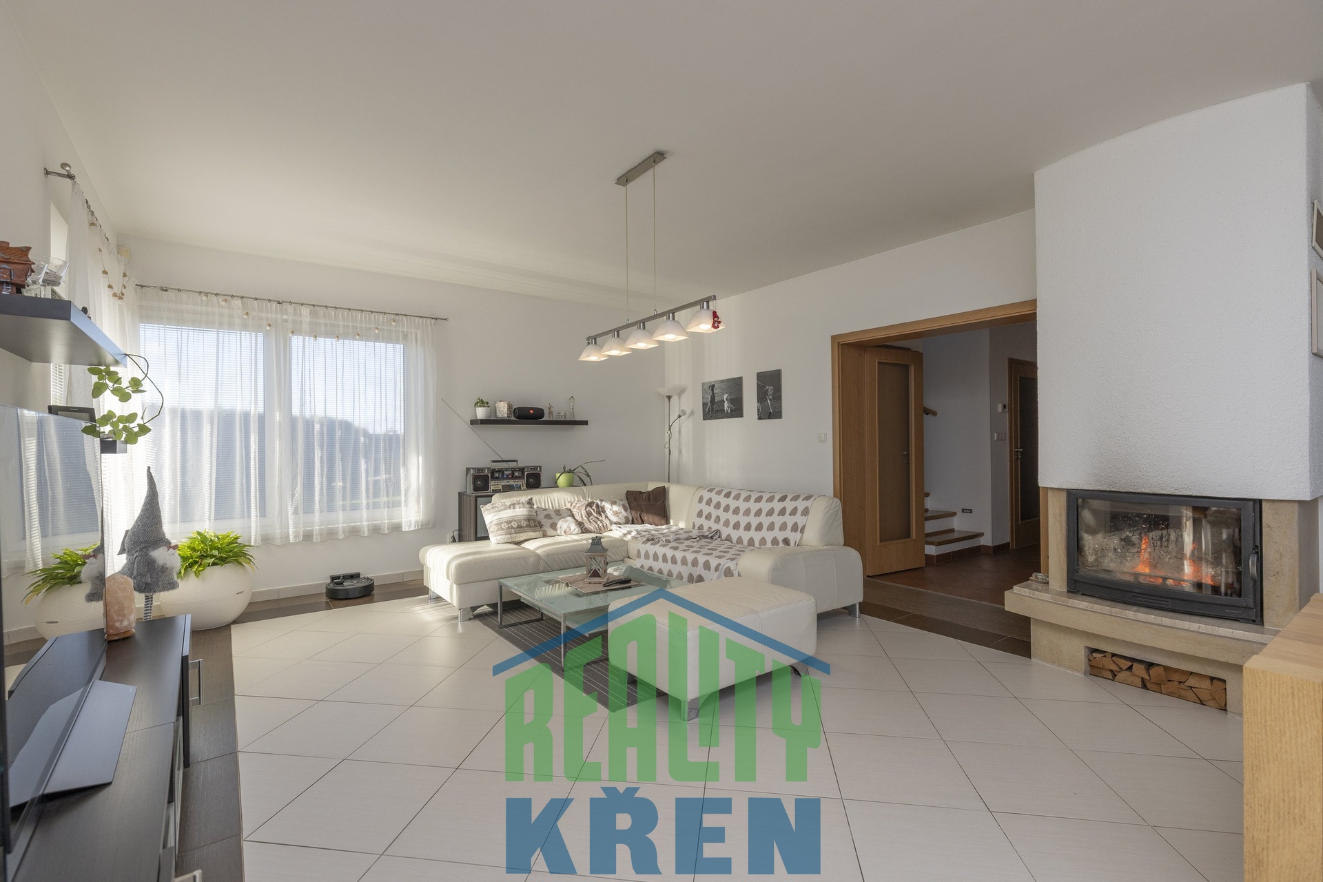 Prodej RD 4+1, 151 m2, s terasou a garáží, ulice V Topolech, Unhošť. Vstupní předsíň s vestavěnými skříněmi, obývací pokoj s krbovými kamny (vložka a komín Schidl) a vstupem na terasu a zahradu, kuchyně s vestavěnými spotřebiči, spíž, koupelna se sprchovým koutem a WC, schodiště do patra, kde se nachází 3x ložnice, koupelna se sprchovým koutem, vanou a WC (elektrické podlahové vytápění). V přízemí teplovodní podlahové vytápění.