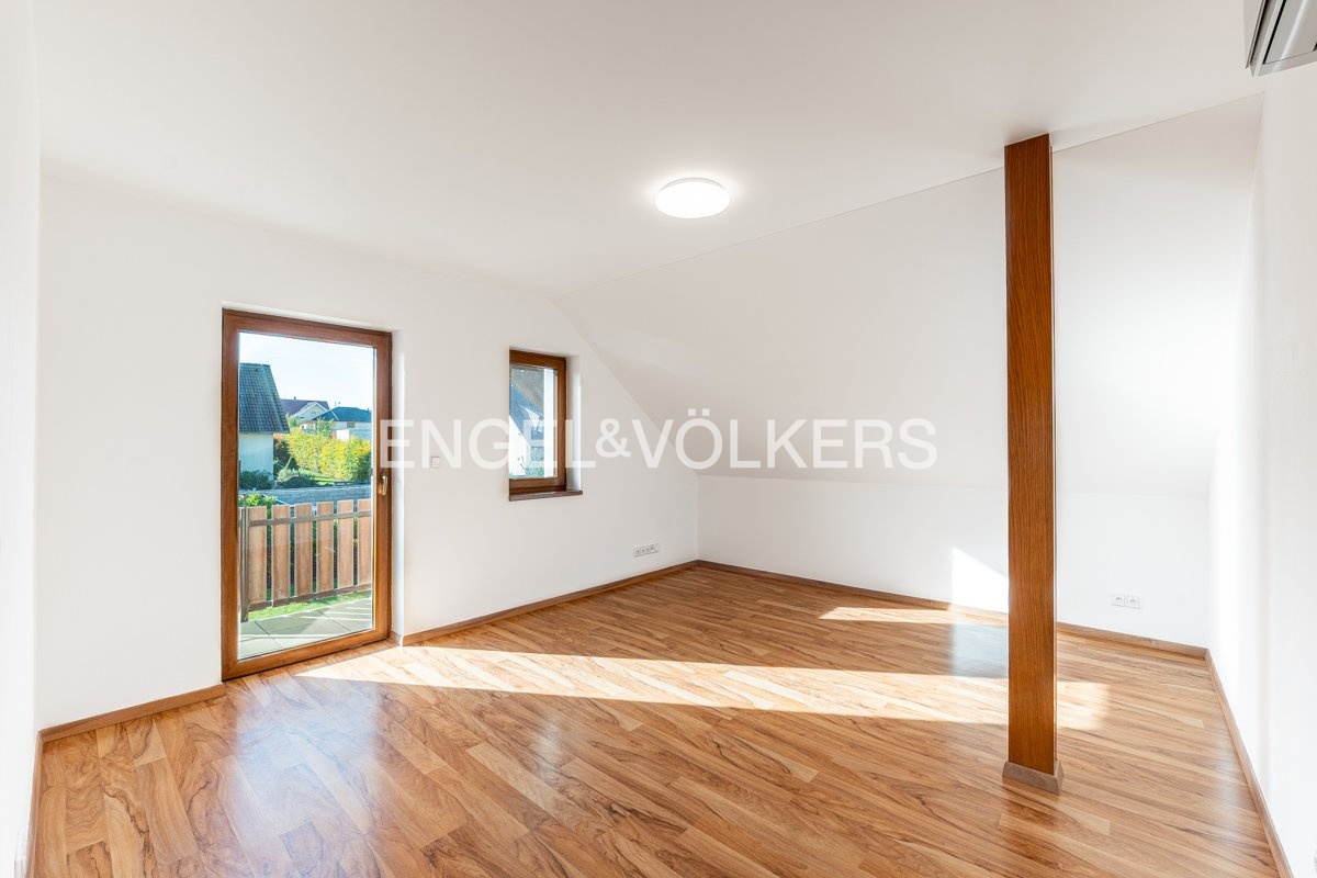 Přízemí dále nabízí praktickou spíž, technickou místnost s pračkou, koupelnu a úložný prostor. V podkroví se nachází obytná zóna se třemi prostornými ložnicemi, samostatnou místností ideální pro pracovnu či šatnu, druhou koupelnou, odděleným WC a v neposlední řadě prostorný balkón.