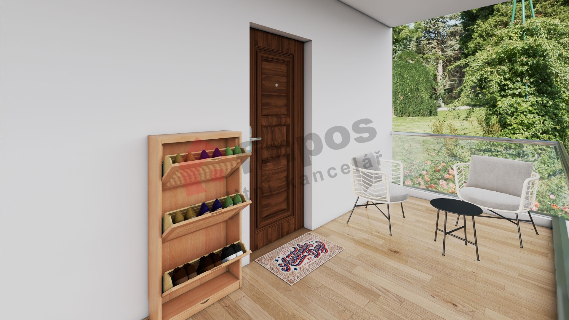 Nabízený byt č.6 je umístěn ve 2 patrech. Prostor v 1.patře 44 m2, v podkrovním patře 44 m2, z toho samostatné wc má 2 m2 a koupelna 5,2 m2 jsou umístěny v 1.patře. Vizualizace nabízí jen pohled na první patro, které lze točitými schody rozšířit o podkrovní patro.