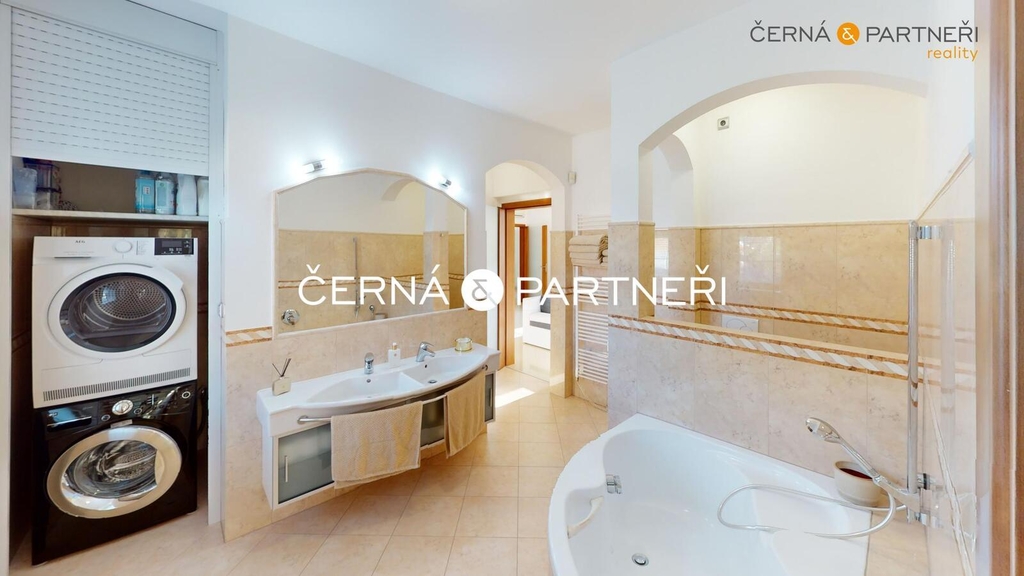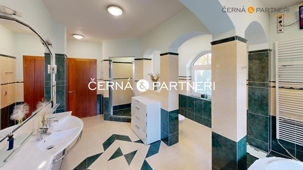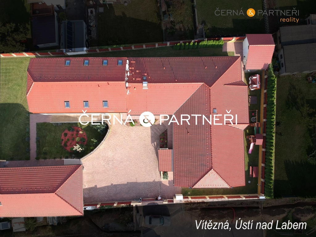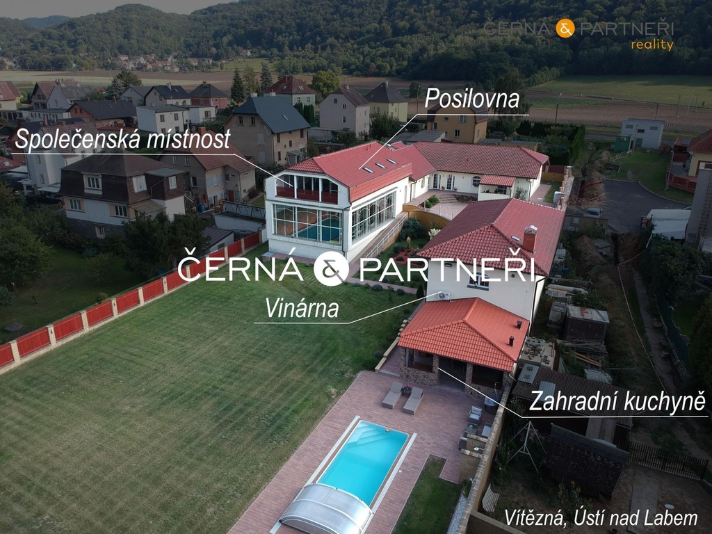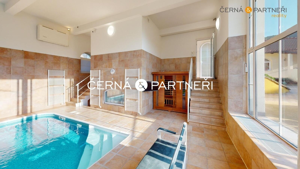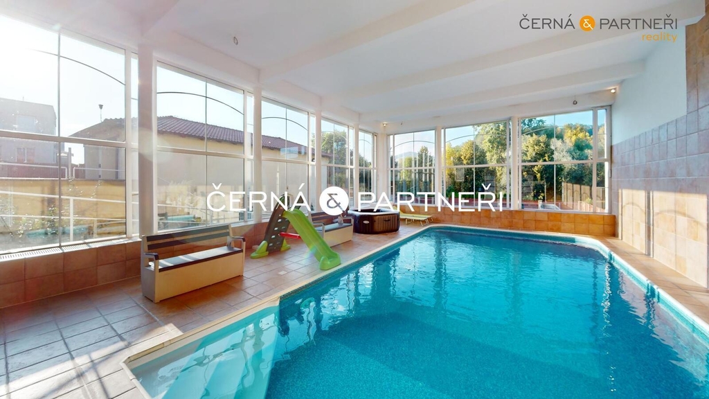V zastoupení majitele nabízím k prodeji luxusní rodinný dům se dvěma byty ( zastavěná plocha 485 m2), garáží (116 m2), vnitřním a venkovním bazénem, dále je tu , fitness, letní místnost (vinárna), letní kuchyně, technická místnost, zahradní domek na nářadí, dále zahradní dům opatřeným wifi, televizí, topením, ventilátorem a soukromé dětské hřiště. Celý objekt (bez vnitřního bazénu a fitness) je bezbariérový, celková plocha pozemku je 2 680 m2.