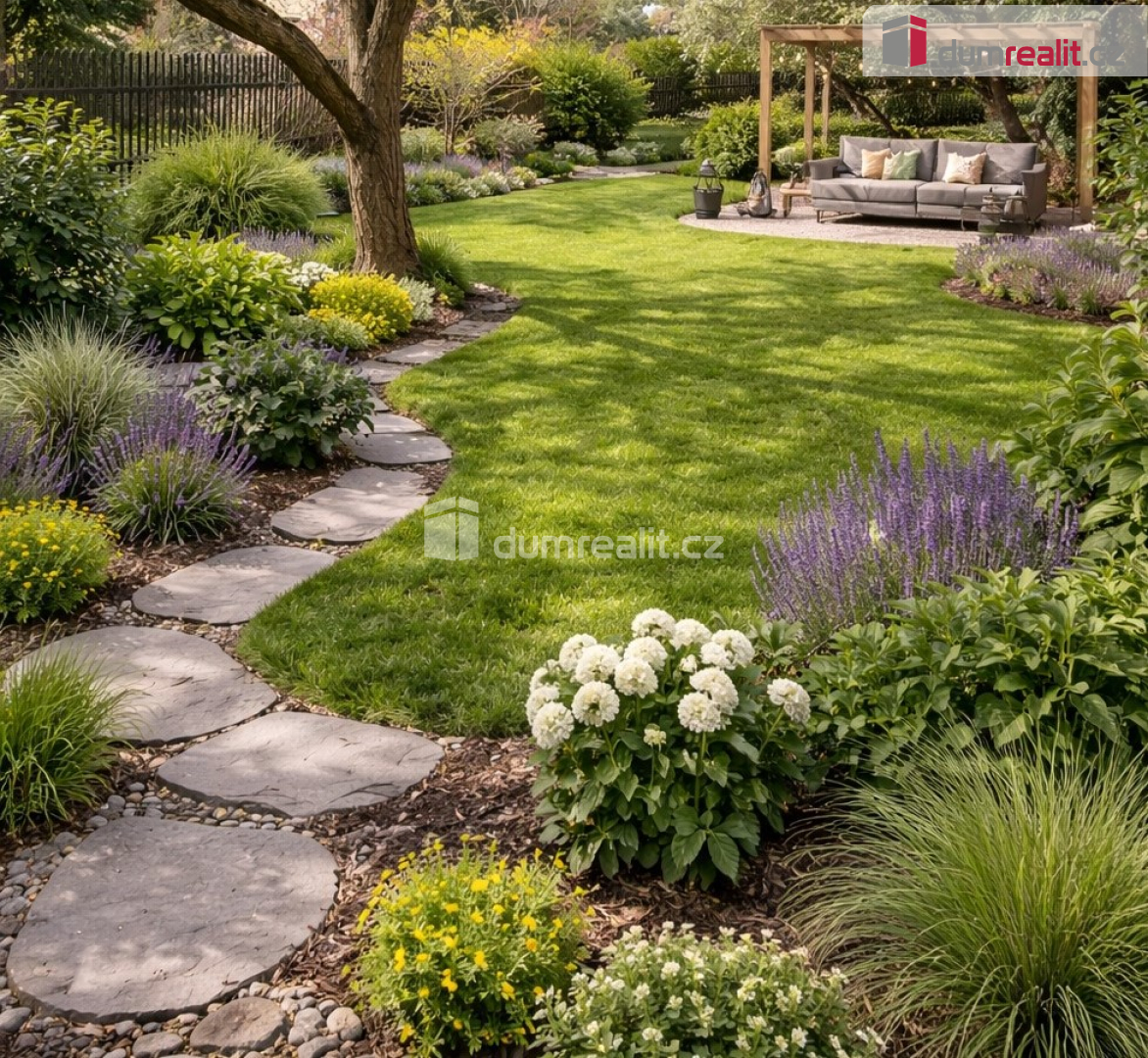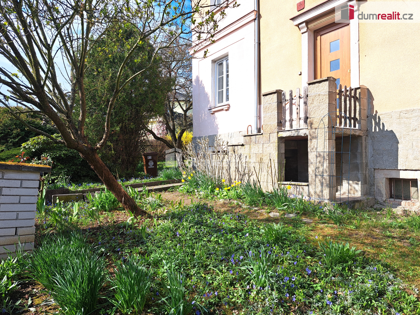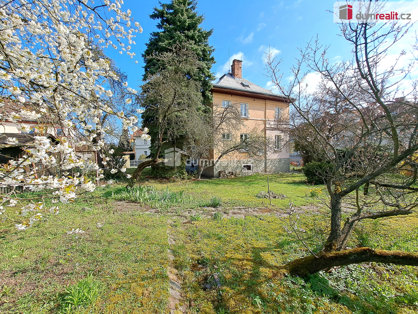 Okolo celého domu je rovinatá, slunná zahrada se vzrostlými stromy.