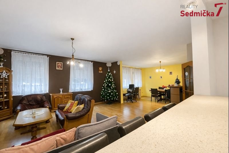Po pravé straně se nachází rozlehlý obývací pokoj propojený s jídelnou o velikosti přibližně 46 m². Tento prostor je světlý, vzdušný a poskytuje komfort pro každodenní rodinný život i společenská setkání. Dispozici lze v případě potřeby upravit a místnost rozdělit na dva samostatné pokoje.