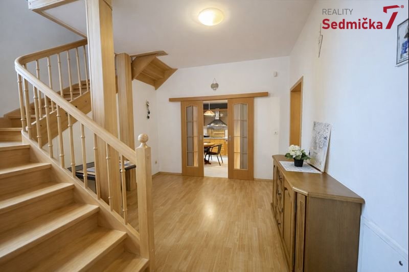 Součástí patra je velká koupelna s toaletou, vanou i sprchovým koutem. Z haly pokračuje schodiště do podkroví.