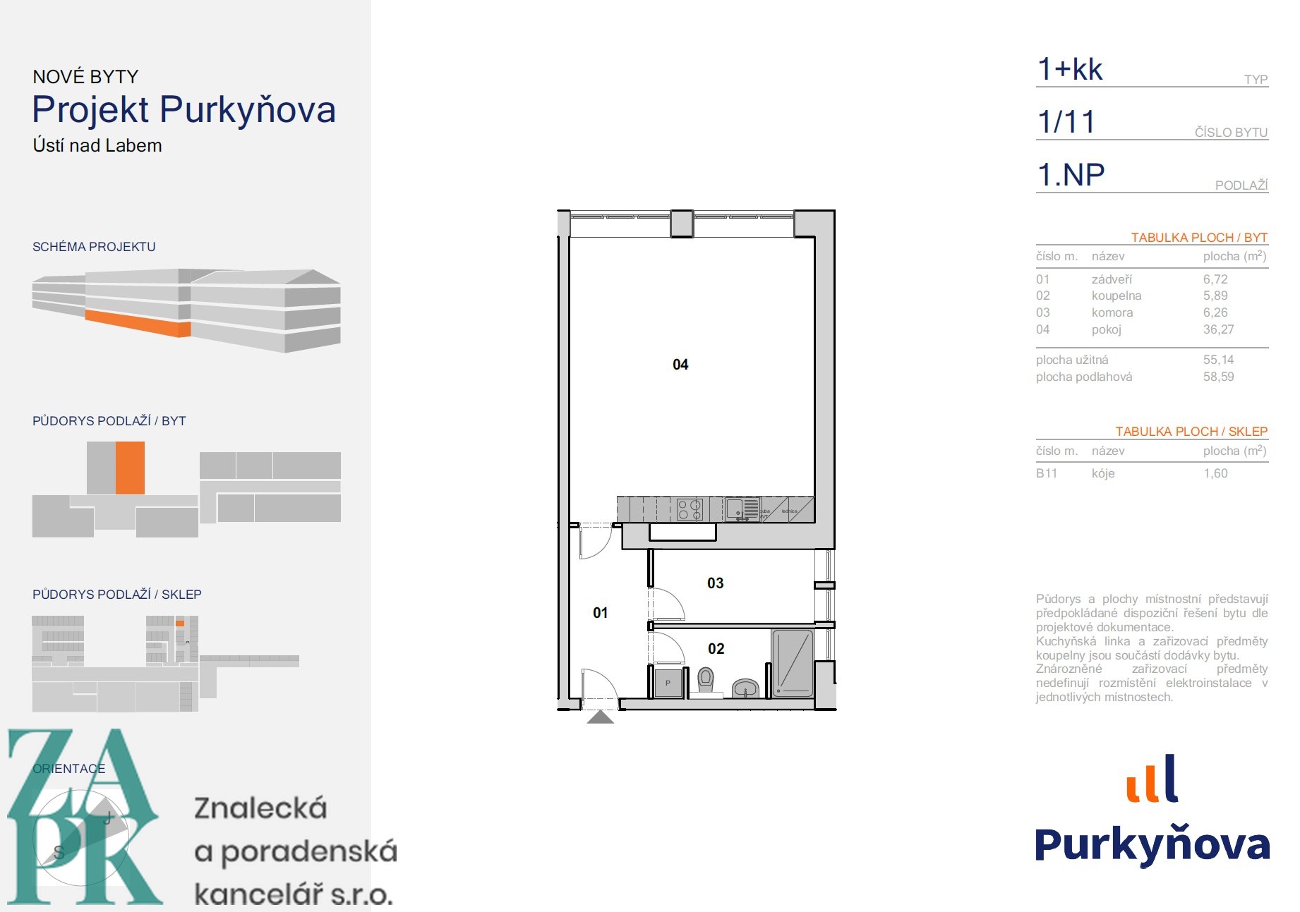 Dispozice bytu - vstupní chodba, koupelna se sprchovým koutem, kuchyň vybavená linkou se spotřebiči a jeden neprůchozí pokoj. Půdorys bytu je k dispozici v galerii. Díky velkým oknům a příznivé orientaci je byt světlý, vzdušný a působí příjemným dojmem.