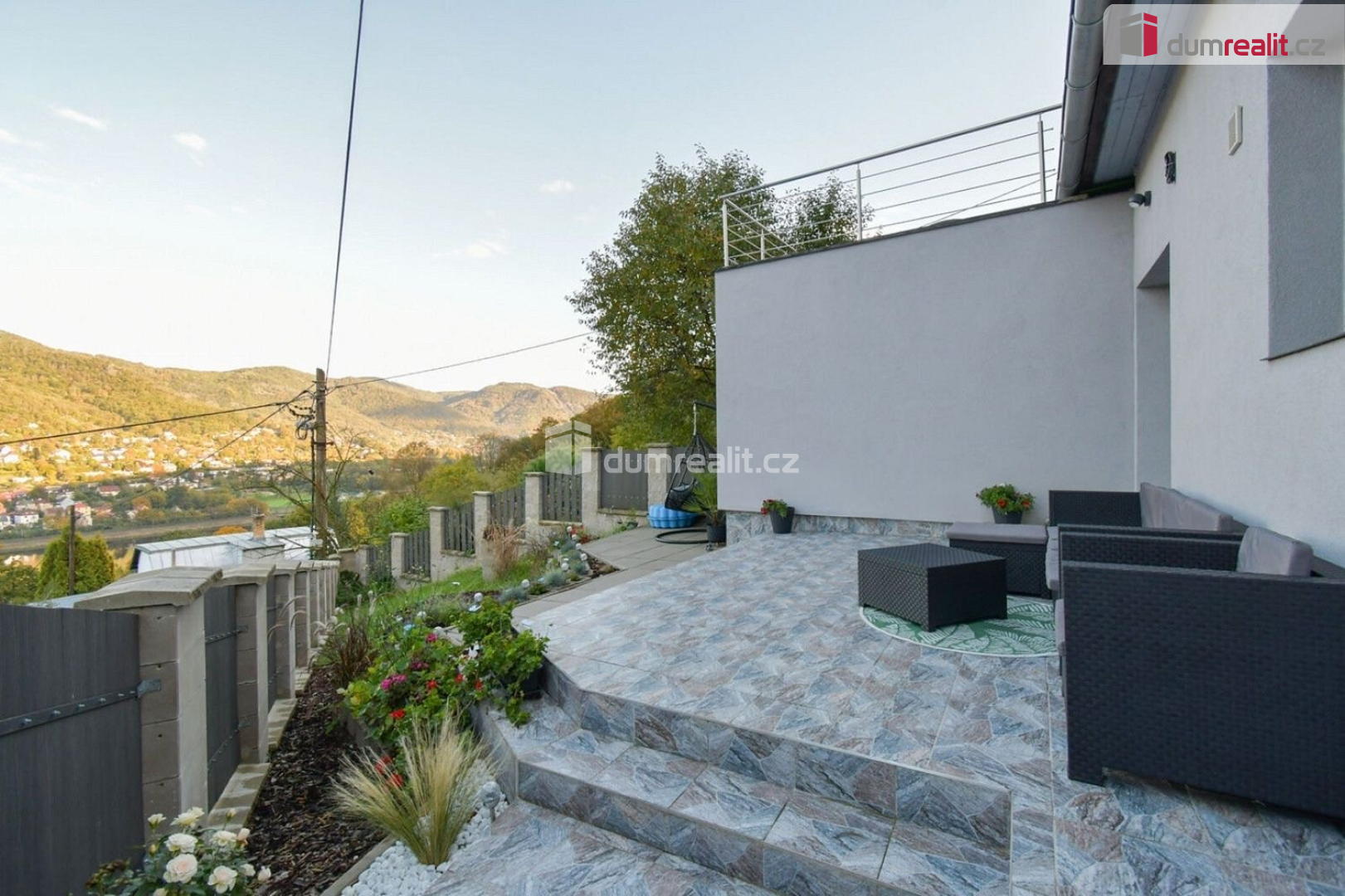 K domu náleží terasa, plocha pro ideální pro odpočinek, grilování nebo posezení na terase s výhledem na krásy Českého středohoří.