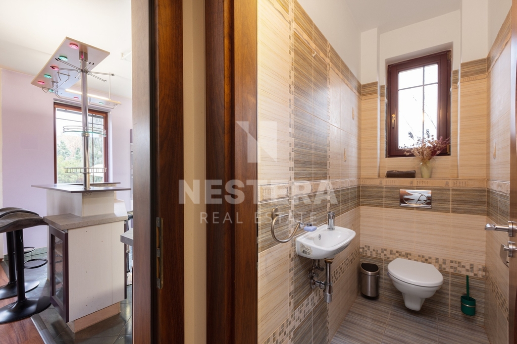 Po schodišti se dostanete do chodby v prvním patře, odkud je přístup do čtyř ložnic, z nichž dvě mají vstup na menší balkon s výhledem na Klánovický les. V patře je také prostorná koupelna s vanou a dvěma umyvadly a samostatná toaleta s bidetem a pisoárem.