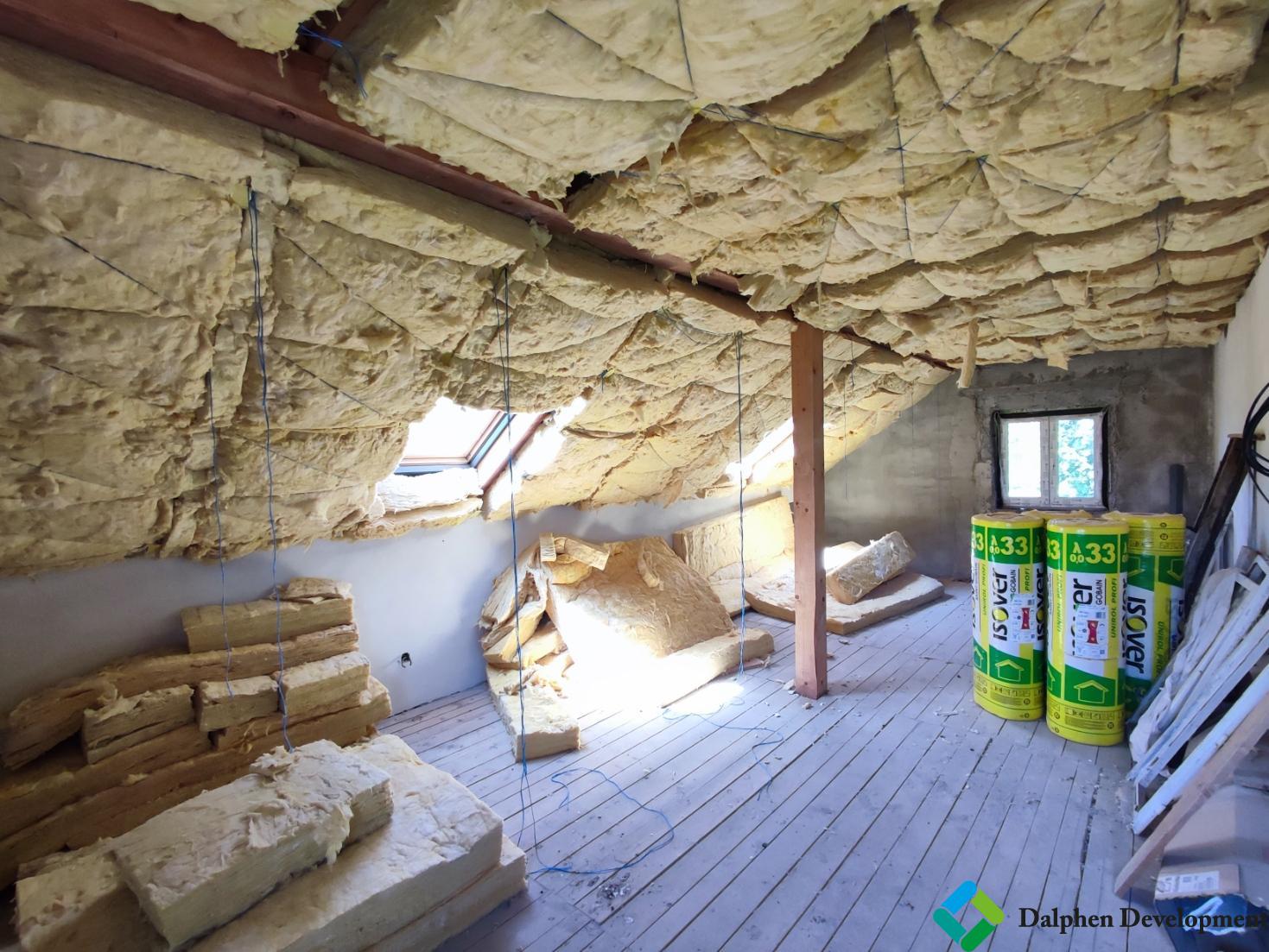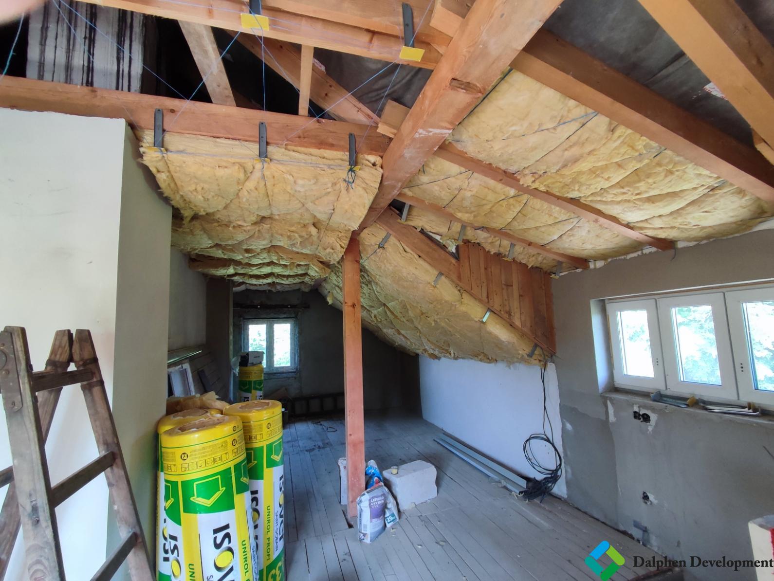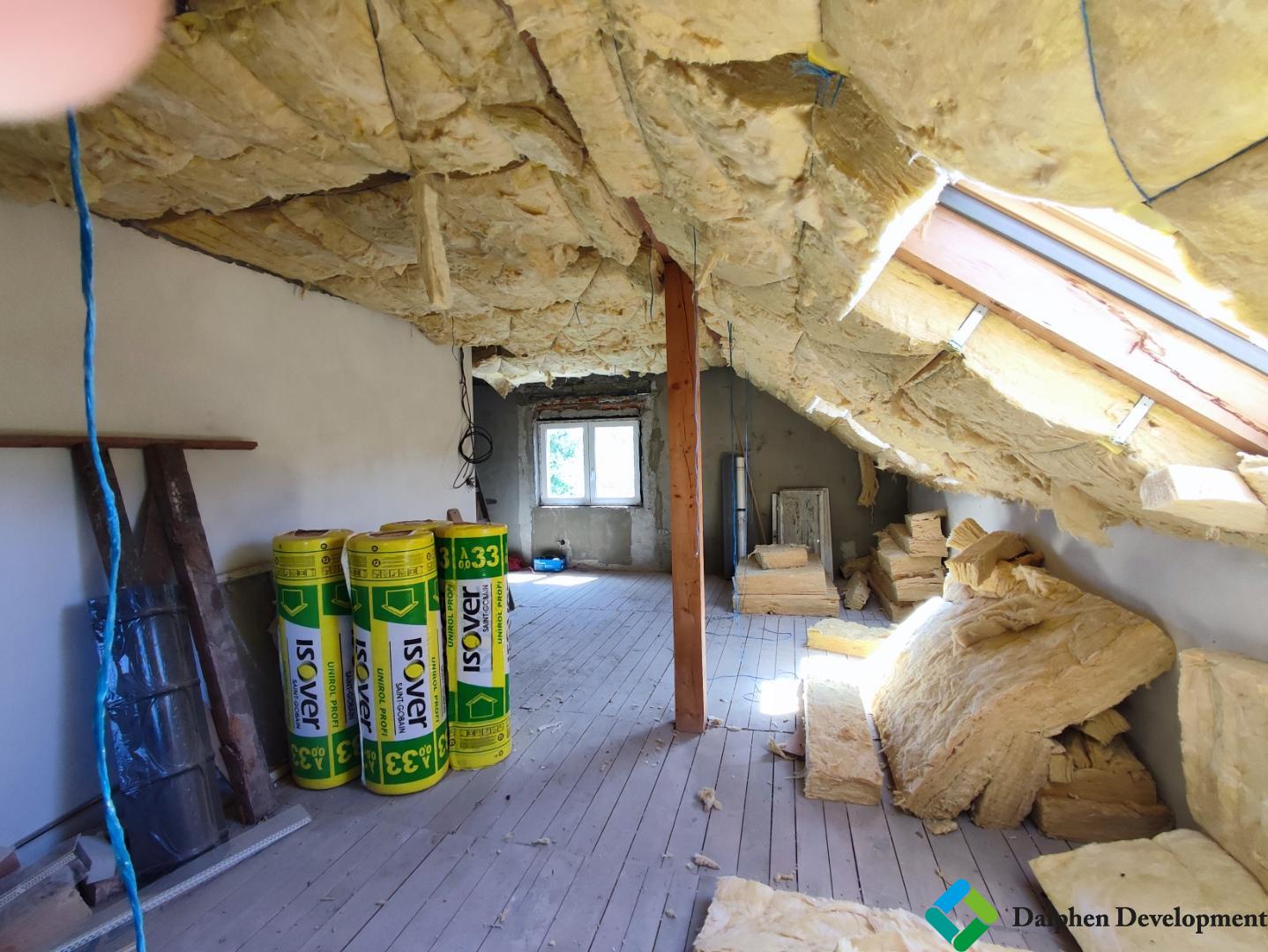 - 2.NP: projektované 2 místnosti + koupelna, nyní otevřený prostor- původní konstrukce domu byla zvednuta kvůli světlé výšce a byl udělán věnec, komplet nová střecha - pokryta plechem Satjam, kvalitní dřevěná Velux, tepelná izolace vata Isover je v šikminách, ale neuzavřená SDK.
