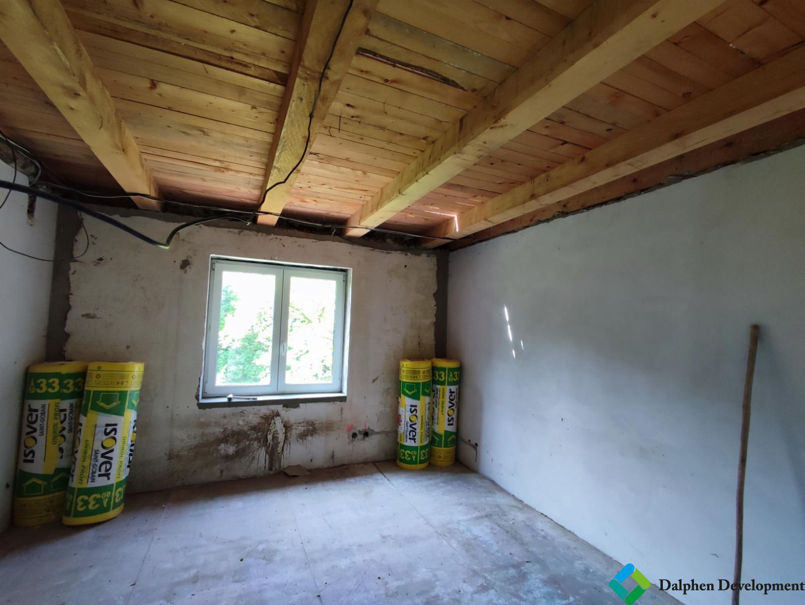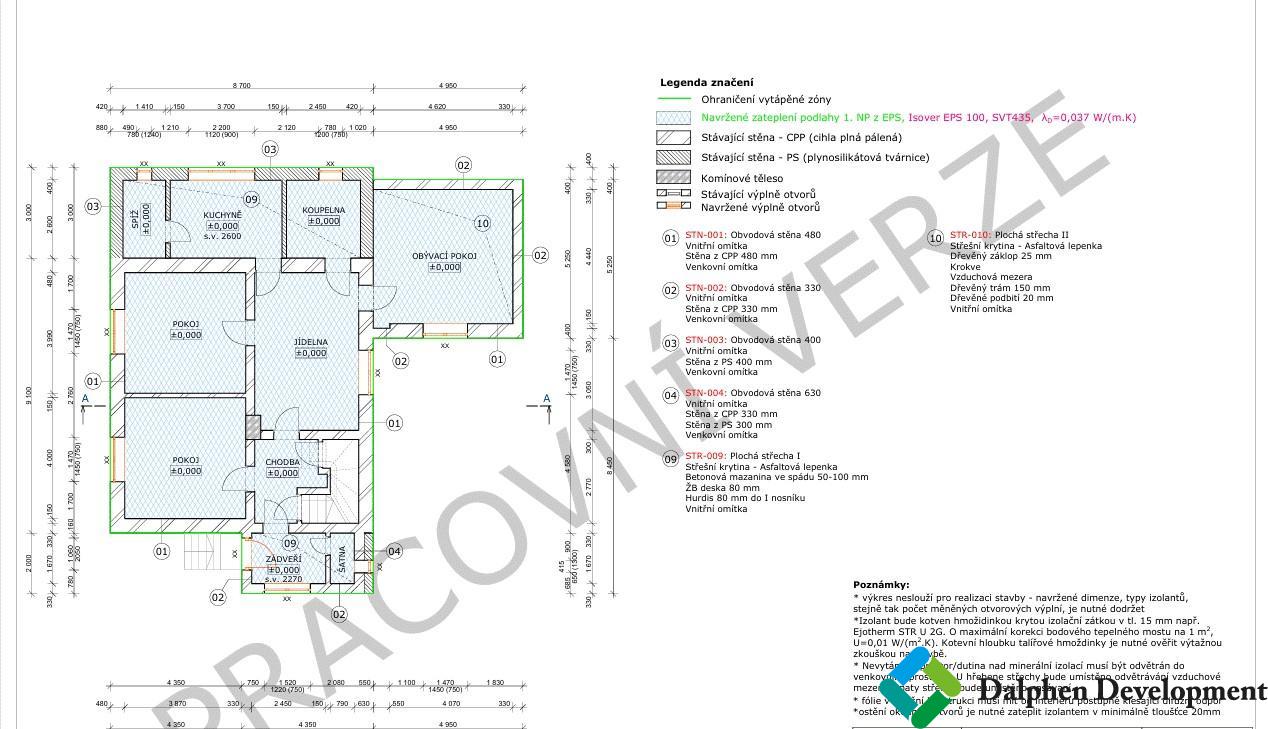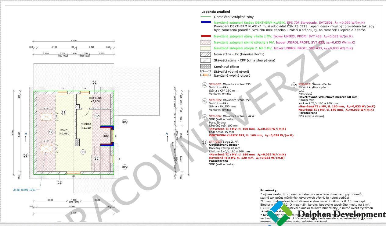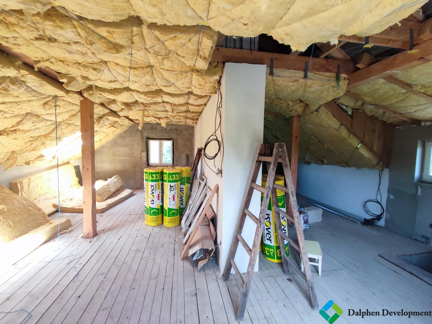 - 2.NP: projektované 2 místnosti + koupelna, nyní otevřený prostor- původní konstrukce domu byla zvednuta kvůli světlé výšce a byl udělán věnec, komplet nová střecha - pokryta plechem Satjam, kvalitní dřevěná Velux, tepelná izolace vata Isover je v šikminách, ale neuzavřená SDK.