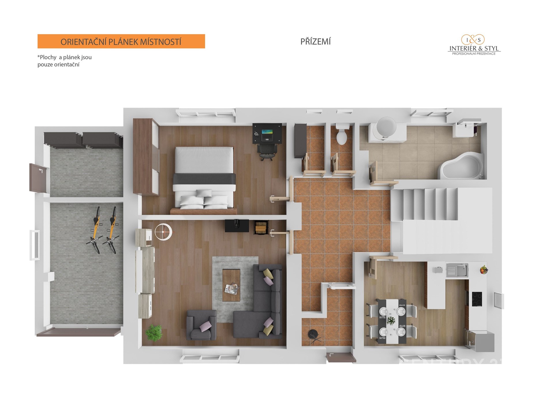 Dispozice 5+2 je mimořádně flexibilní a umožňuje využití domu buď jako dvou samostatných bytových jednotek, nebo jako prostorného bydlení pro početnou rodinu. Jedna kuchyně je plně zařízená, v patře se nachází další místnost připravená k vybudování druhé kuchyně.