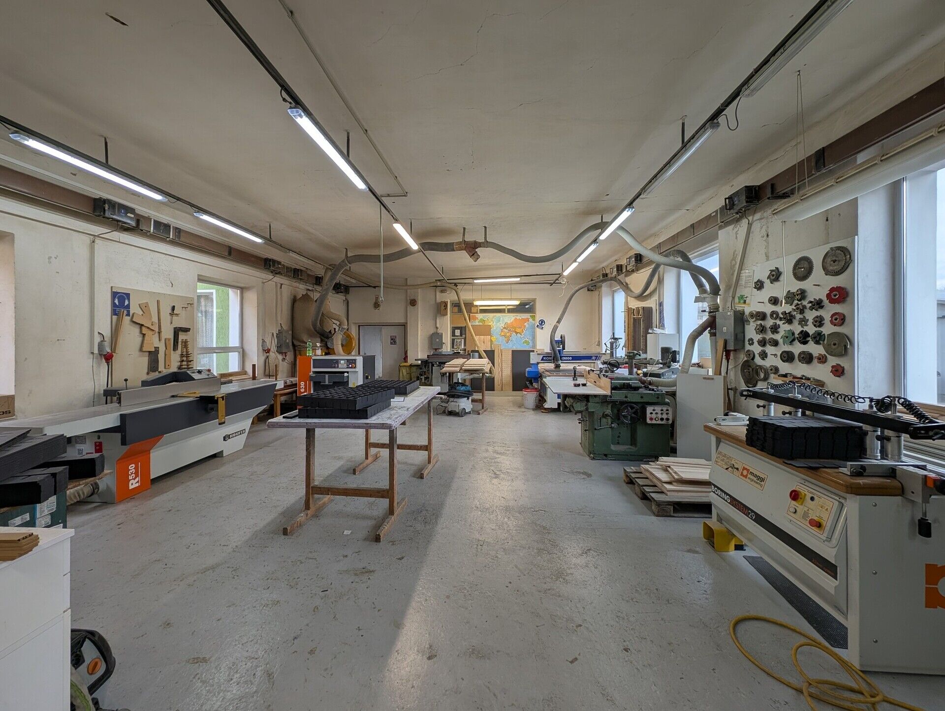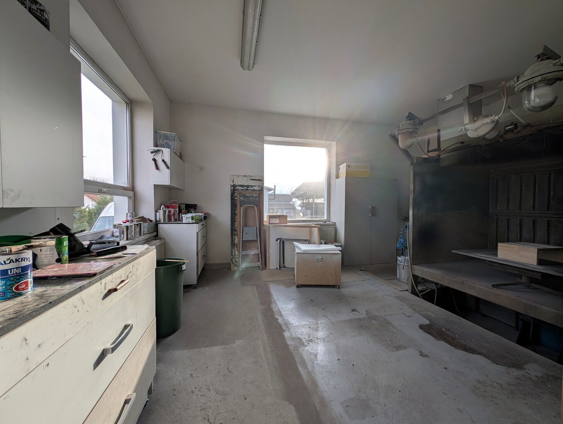 - Plastová okna, moderní zářivkové osvětlení, betonové podlahy.