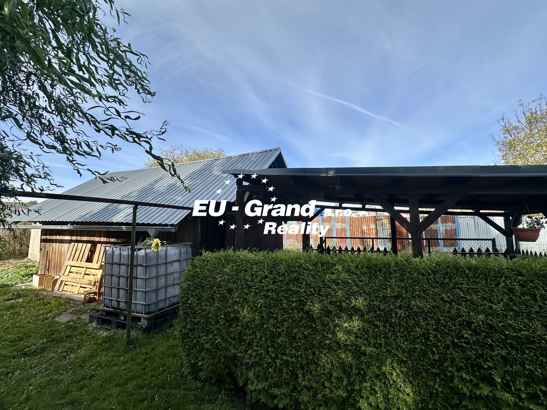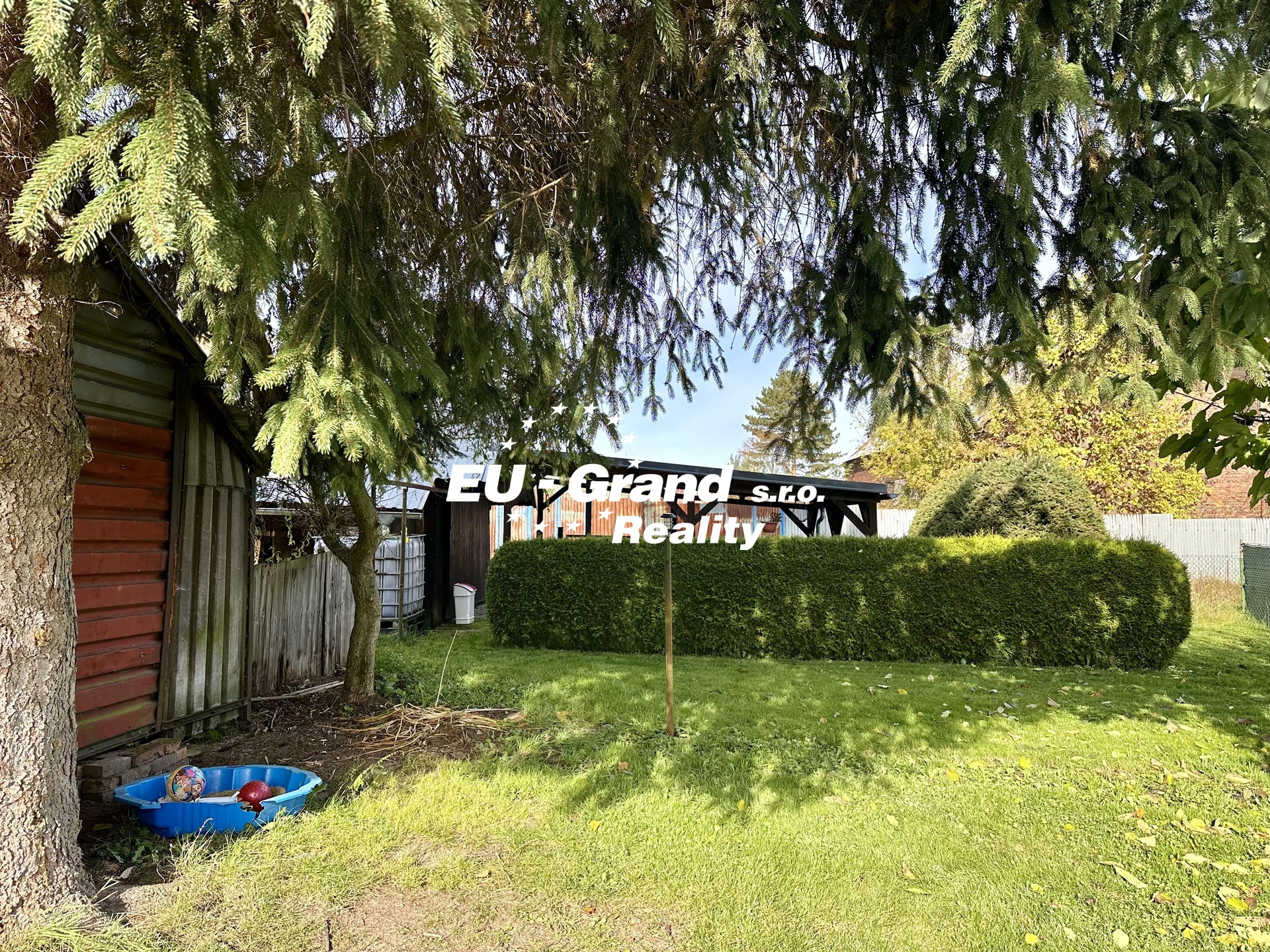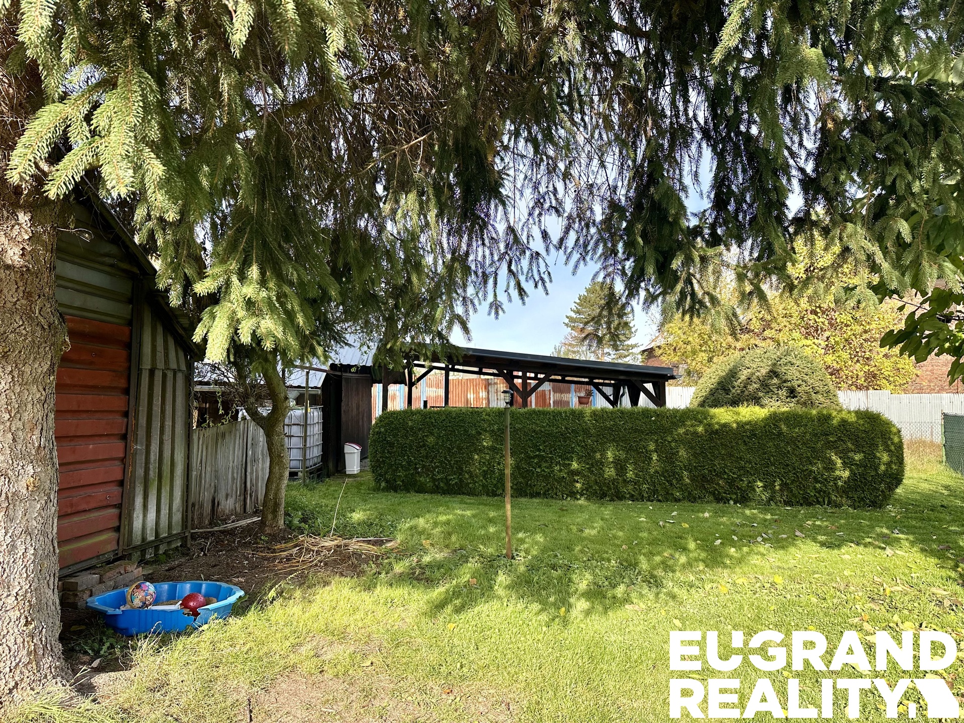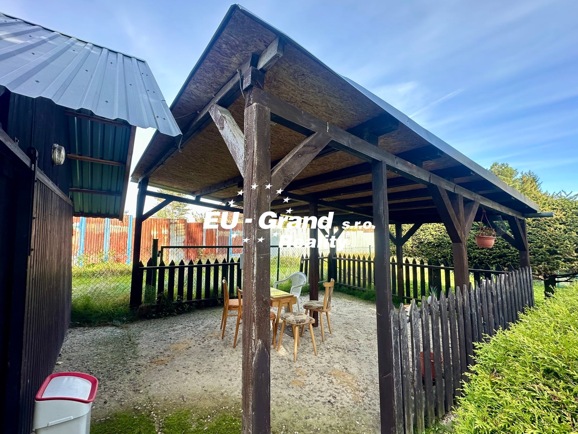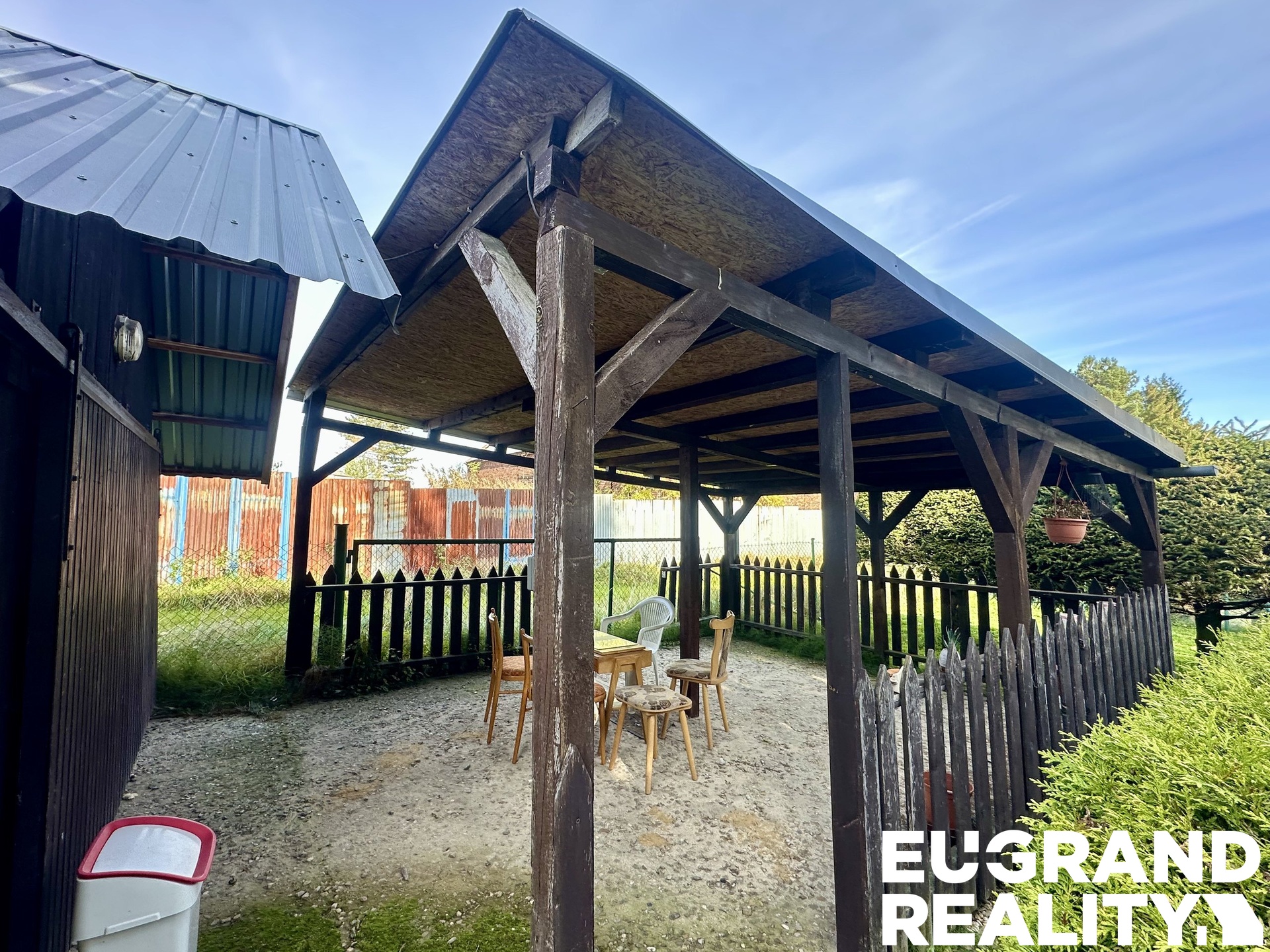 Na pozemku se nachází garáž, hospodářské stavení (dříve využíváno pro chov slepic), pergola a ovocné stromy – jabloň a broskvoň.