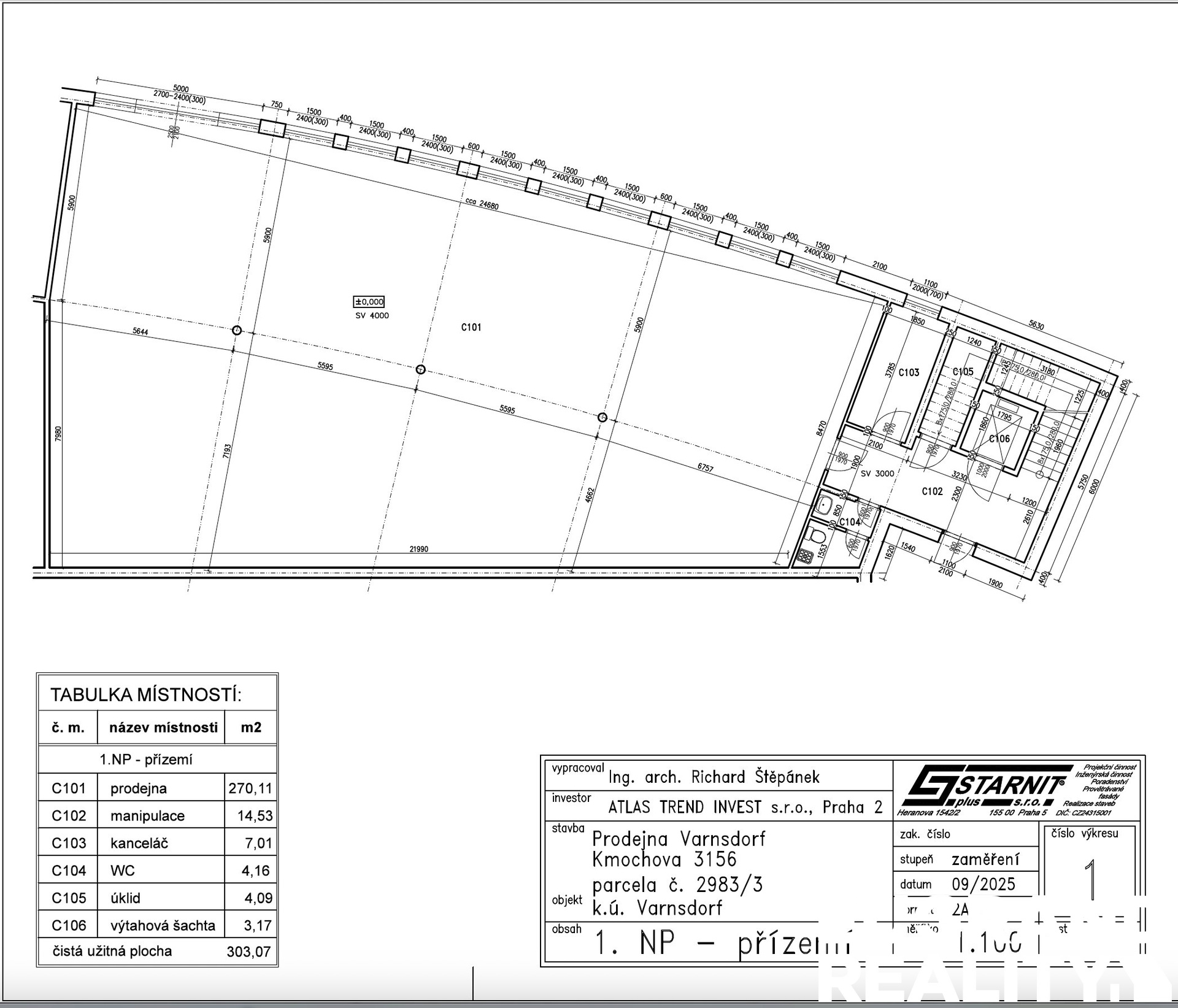 1. NP – prodejní prostor / obchodní část (303,07 m²)