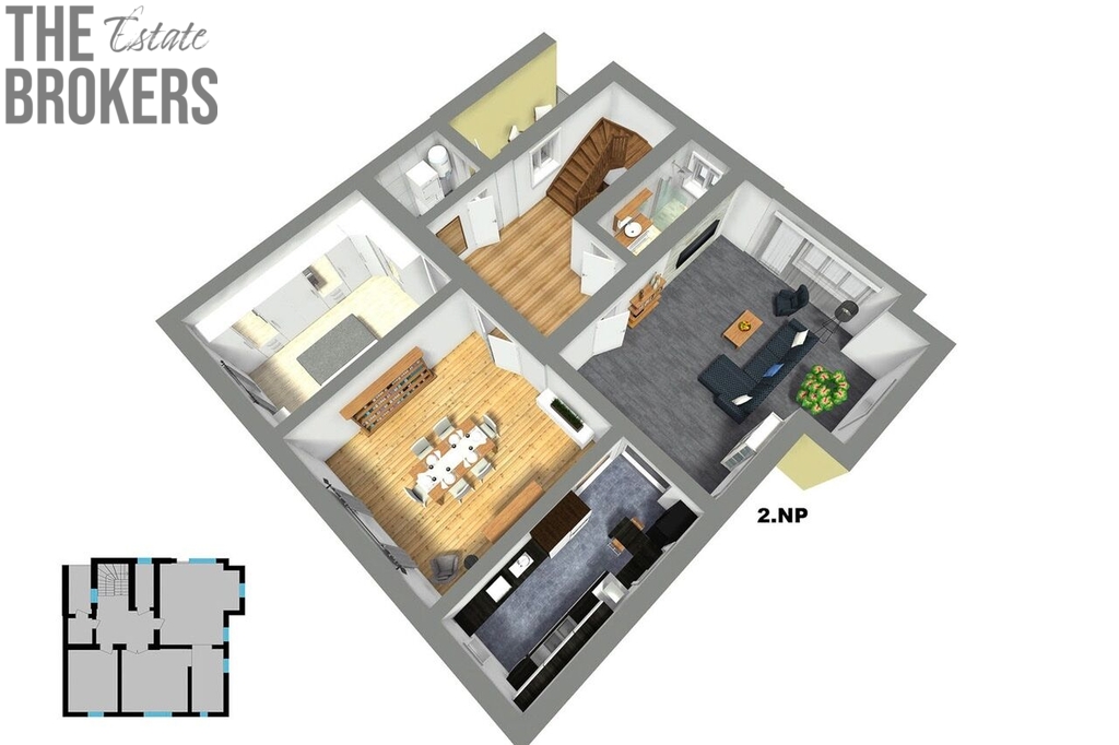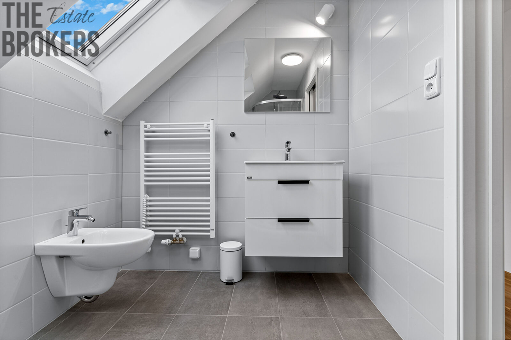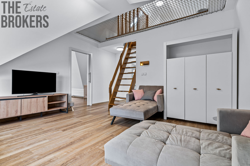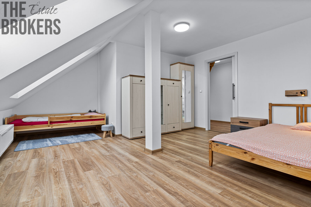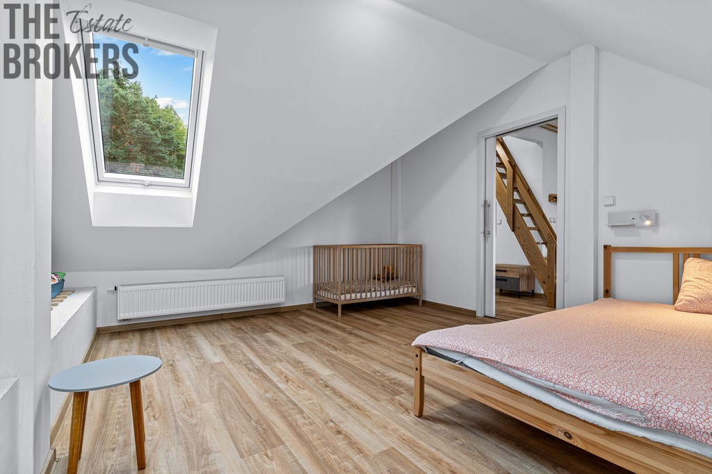 Při vstupu do interiéru neodoláte velmi prostorným pokojům, vysokým stropům a výhledu do přírody. Naopak ve druhém patře se můžete těšit útulným podkrovním prostorům s dětskou hernou dotaženou k dokonalosti sítí pro děti. Samozřejmostí jsou koupelny s moderním vybavením na každém patře a plně vybavená kuchyně v prvním patře. K dispozici je také technická místnost s toaletou. Terasa s výměrou 6,4 m2 a připravený projekt na balkon o velikosti 30,6 m2. K bytu náleží také sklep.