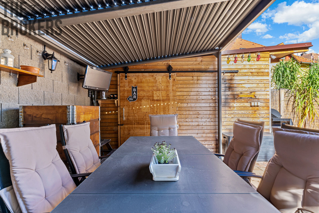 Exteriér neskýtá pouze zahradu o velikosti 395 m2, bazén a pergolu, ale také venkovní kuchyni, technickou místnost k údržbě bazénu, kůlnu a detaily pro maximální pohodlí, soukromí a zábavu na čerstvém vzduchu.