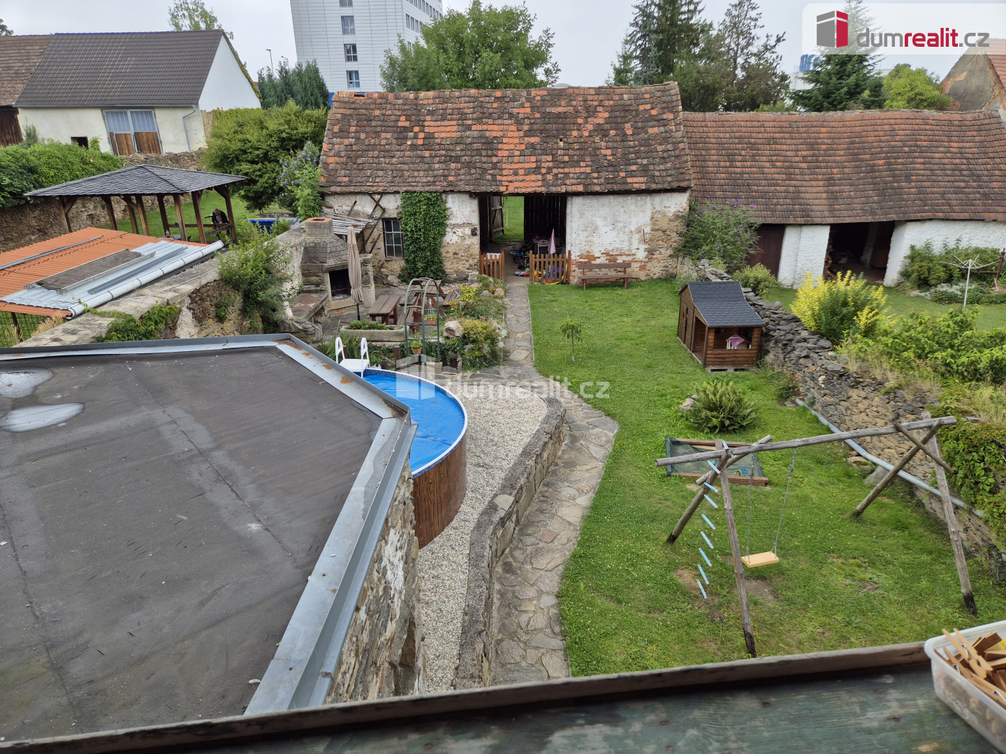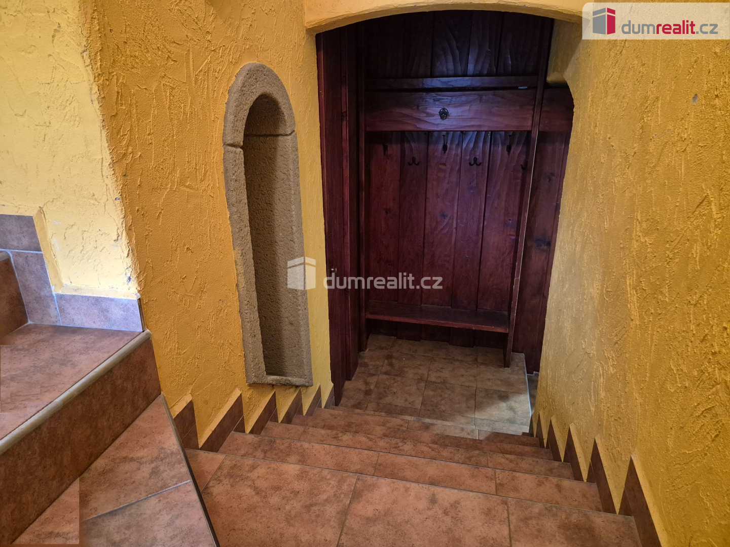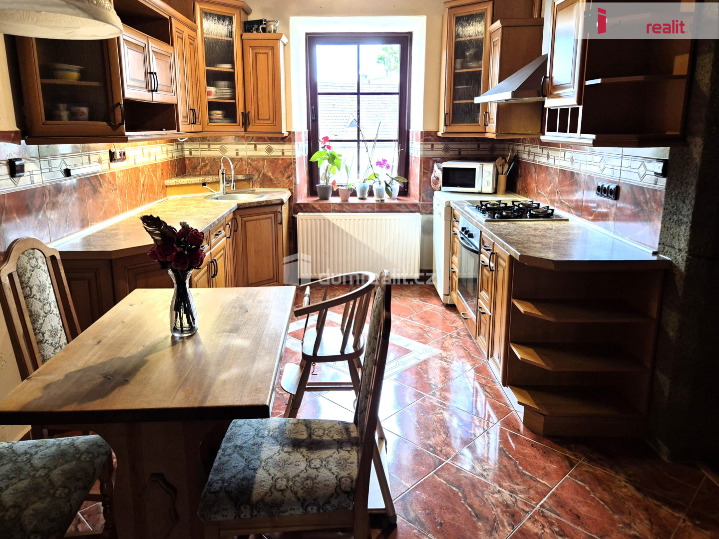 Částečně podsklepený dvoupodlažní dům nabízí v prvním patře prostorný, designově osobitý byt 4+1, kdy tři ze čtyř pokojů jsou neprůchozí a ložnice je napojena otevřeným průchodem na obývák s dekorací z kamene. V koupelně je vana, umyvadlo WC a prostor na pračku. Z centrální chodby je průchod prosklenou stěnou na verandu, ze které je skvělý přehled o dění na zahradě. Dále v podkroví započatou vestavbu, potom zahradu, stodolu a garáž.