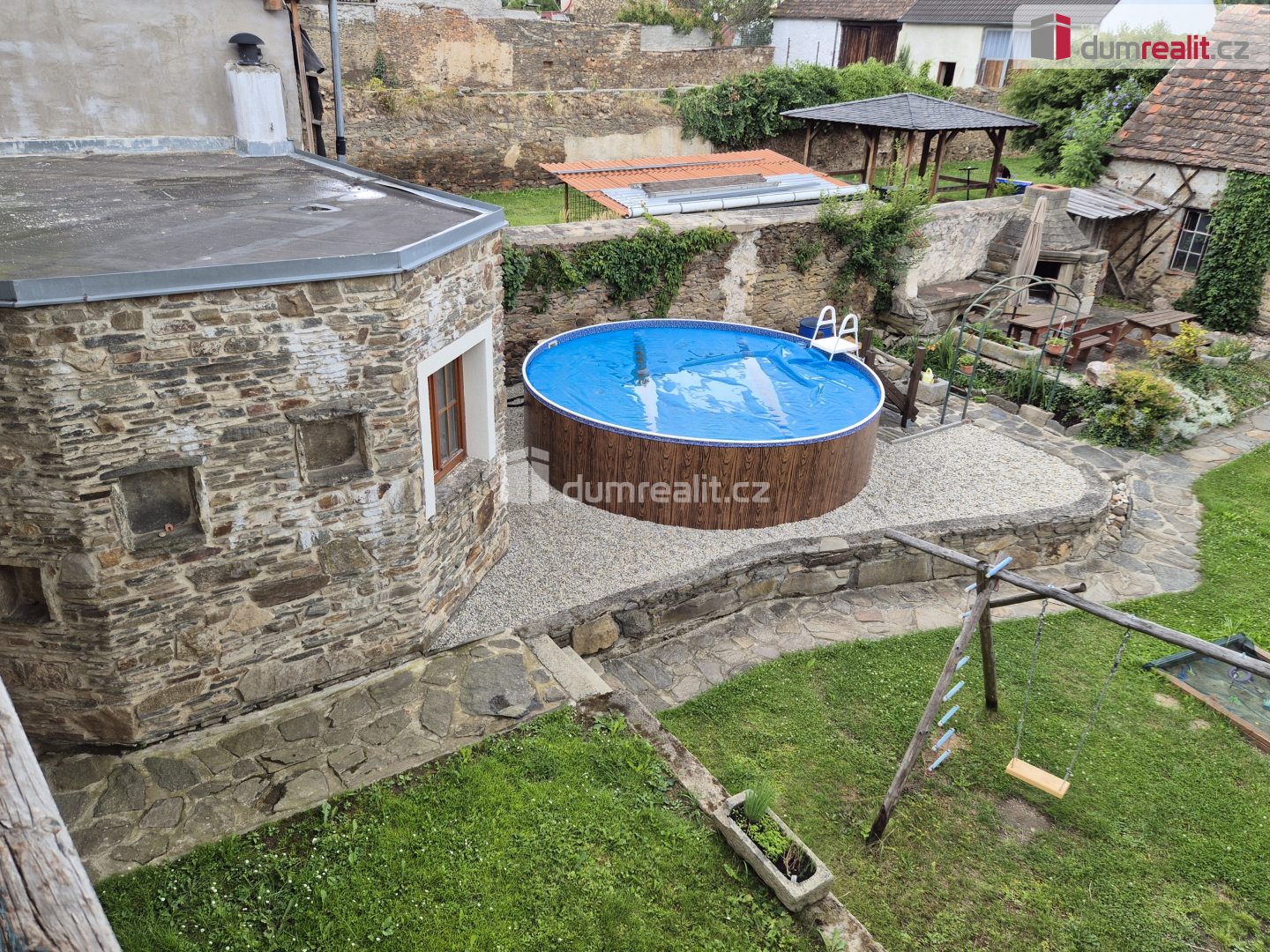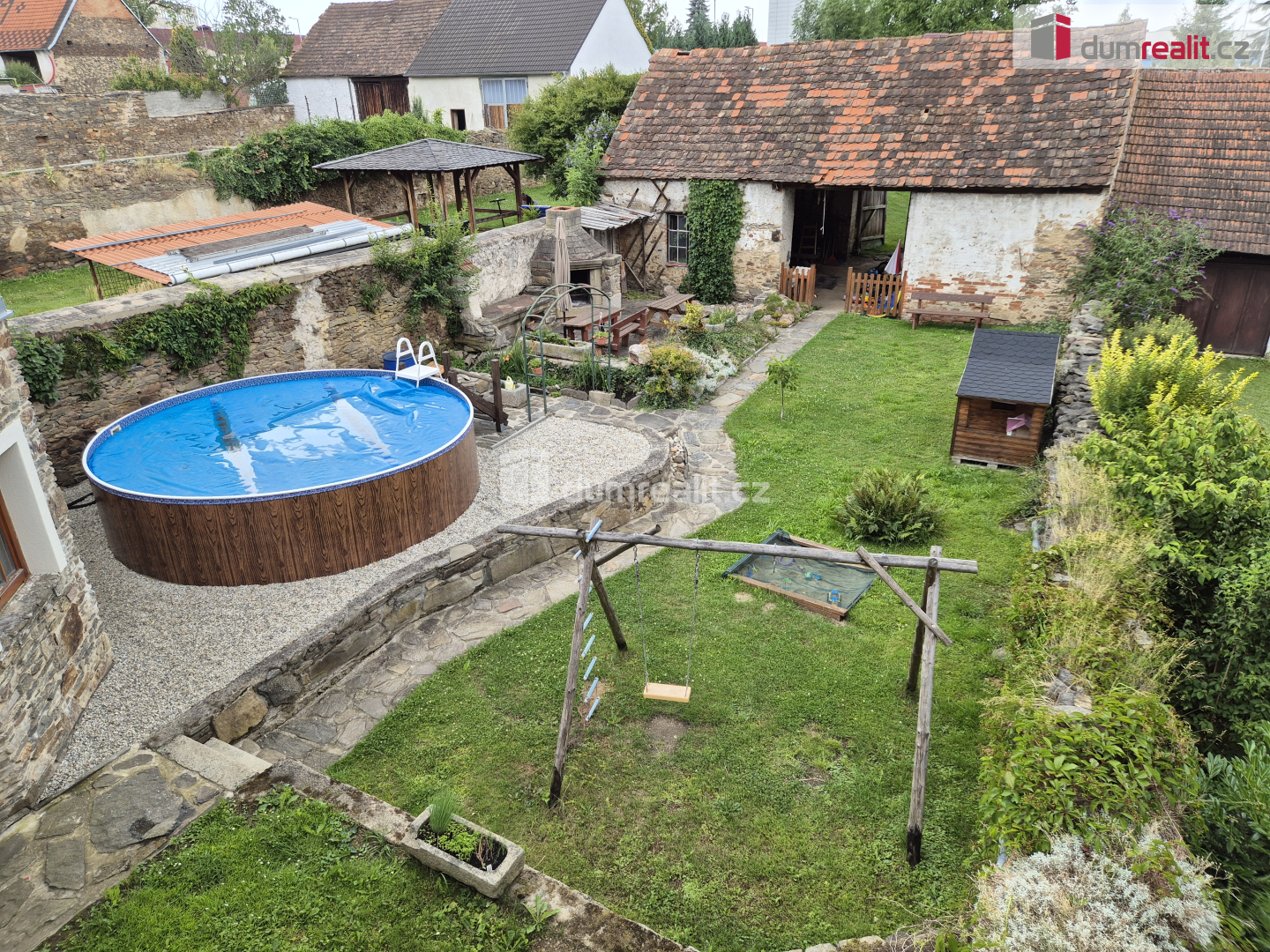 Za domem je příjemný prostor s posezením u kamenného krbu, se zídkami a nadzemním bazénem, navazujícím na průchozí stodolu a zahradu s přístupem od Jihostroje branou, s pergolou, kotcem pro psa, ovocnými stromy a keři. Nachází se zde také garáž, s vjezdem ze silnice.