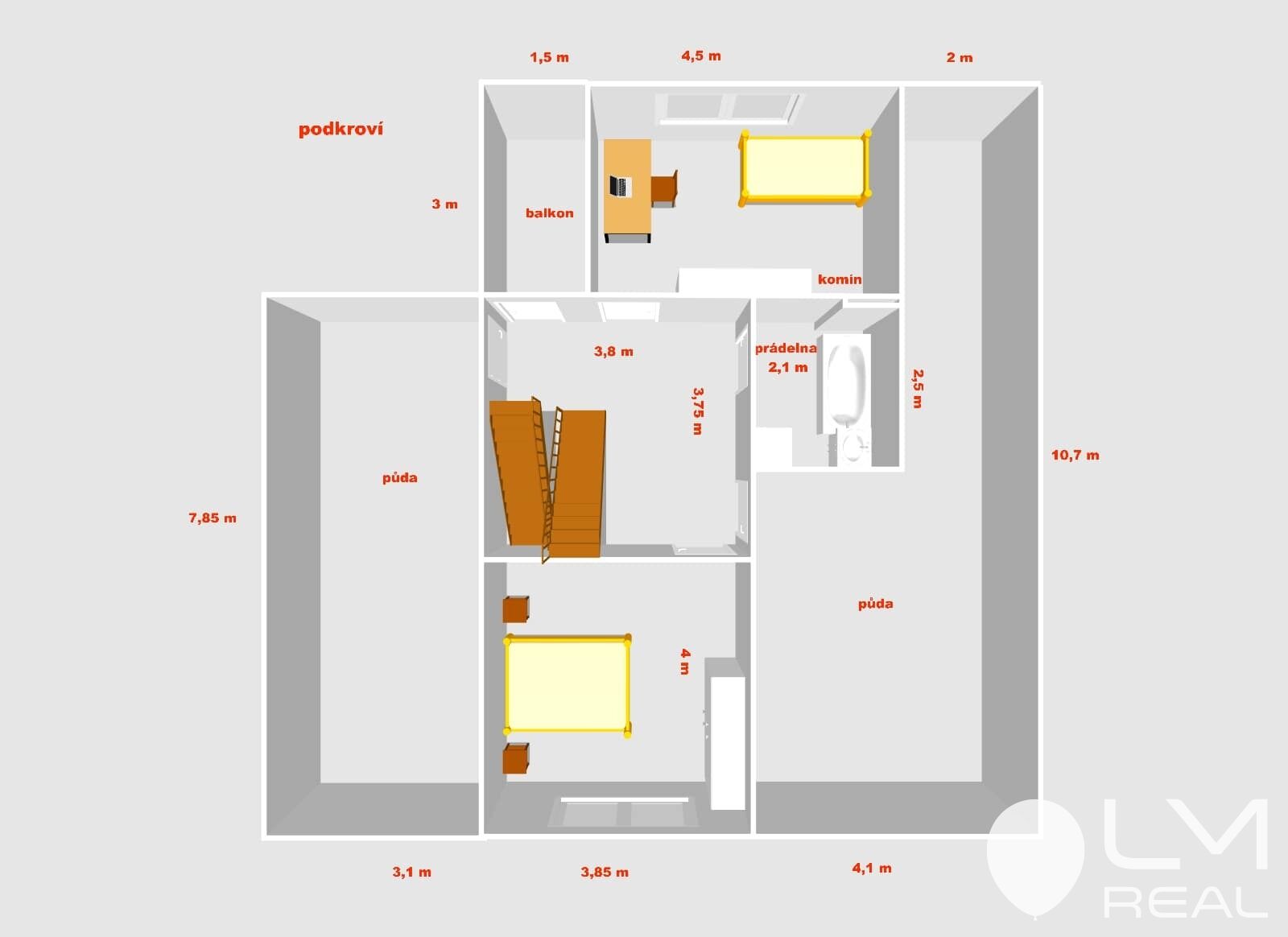 2.NP 41,52 m2: pokoj 16,11 m2, pokoj 13,47 m2, koupelna s vanou 4,75 m2, chodba 14,2 m2, balkon 4,87 m2, 2 x půda – v jedné je dostatečná světlá výška pro další pokoj.