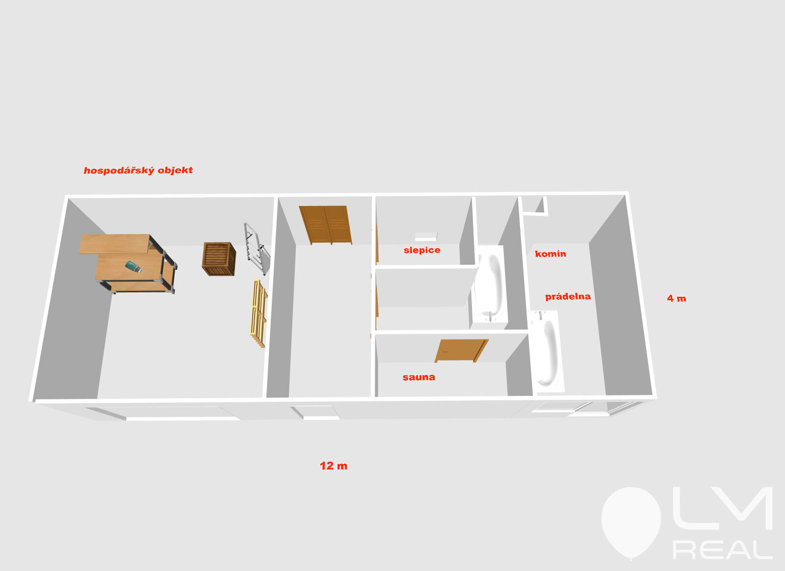 Zděná hospodářská budova 48 m2 je se střechou z pálených tašek a s jedním komínem, elektroinstalace 220 a 380 V. Na milovníky zdravého životního stylu zde čeká na opravu sauna s ochlazovacím bazénkem.