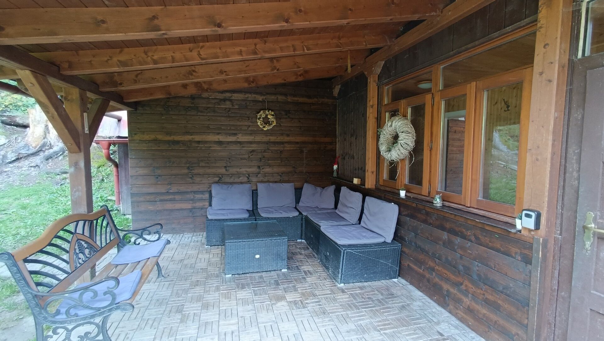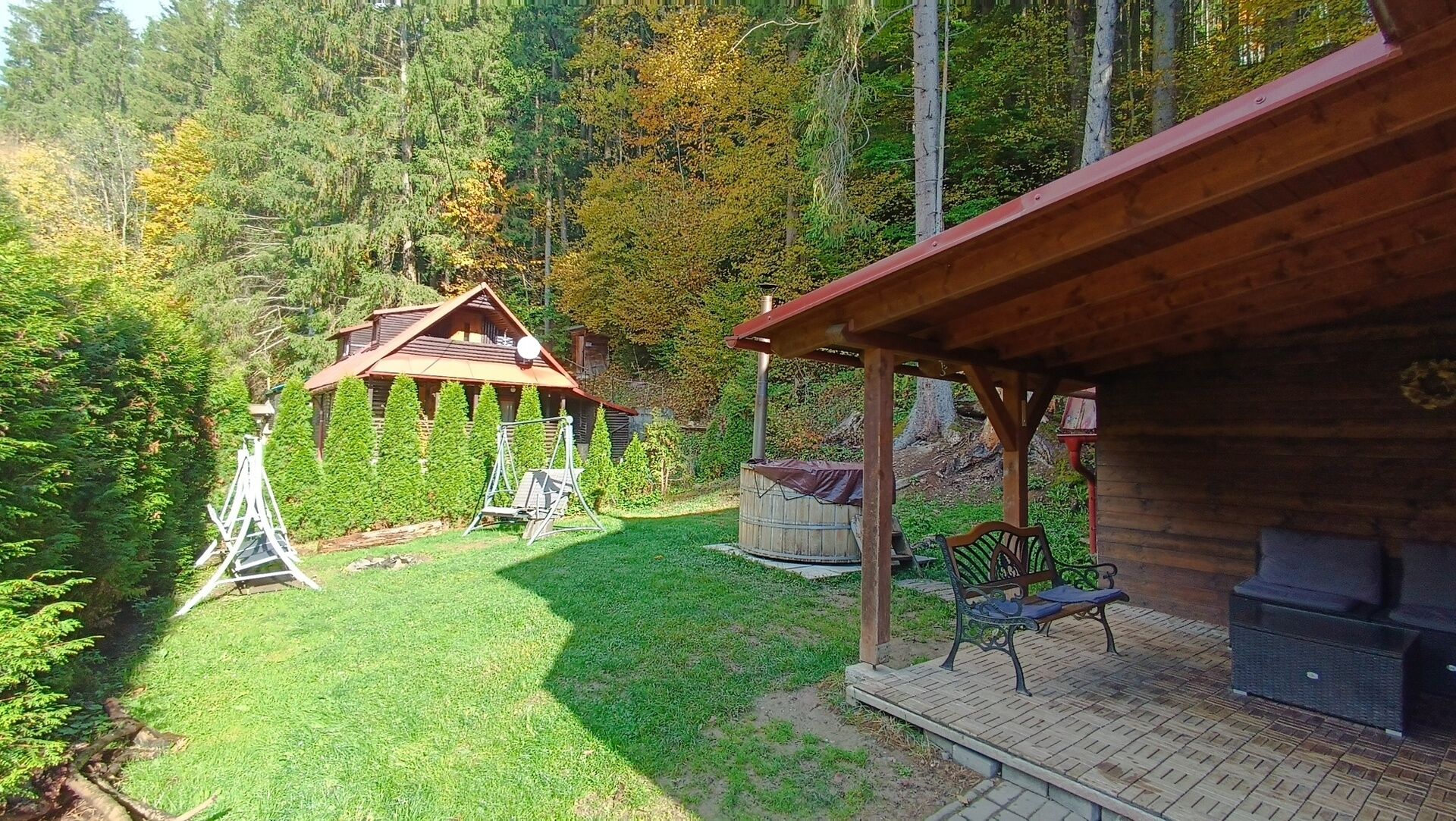 Pozemek nabízí příjemnou míru soukromí. K dispozici je též venkovní koupací sud, gril, houpačka, aj. Zahrada je ohraničena živým plotem a před chatou protéká potůček, přes který vede můstek na příjezdovou cestu, kde se nacházejí parkovací místa.