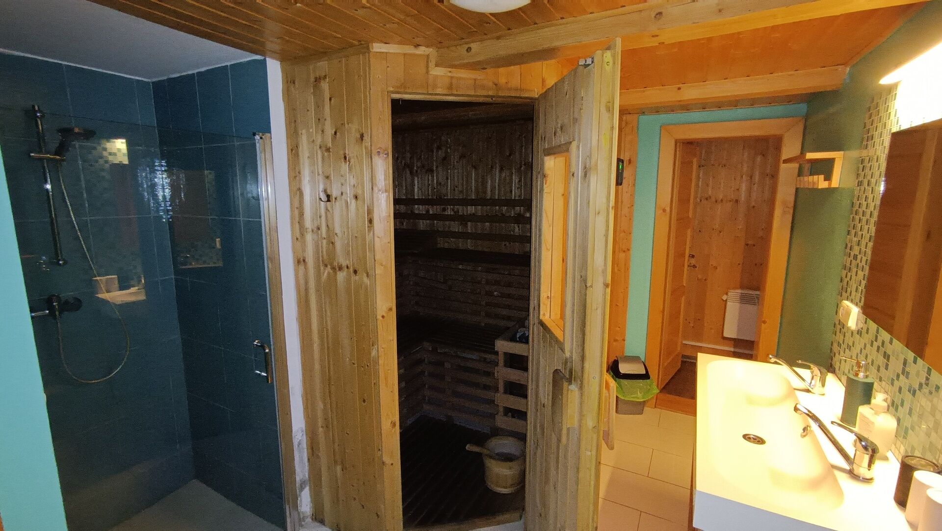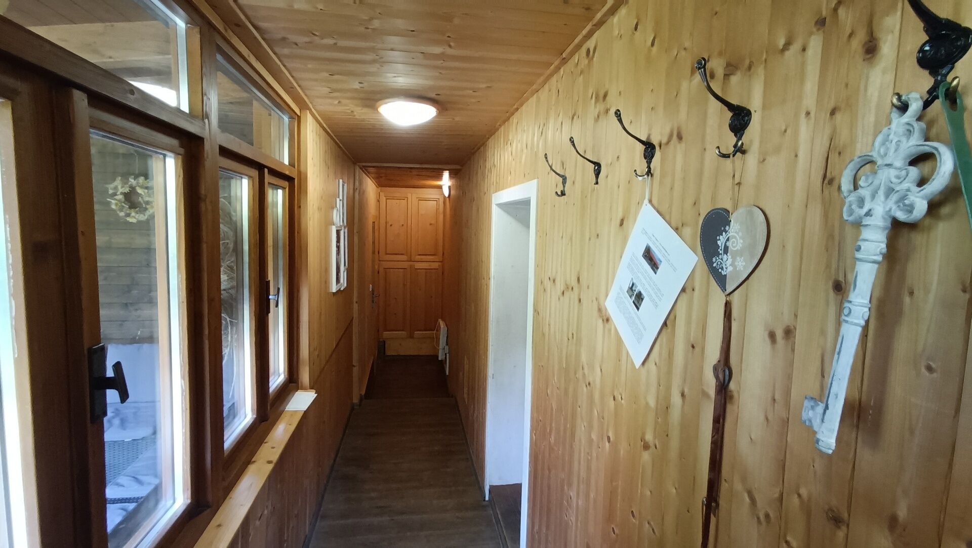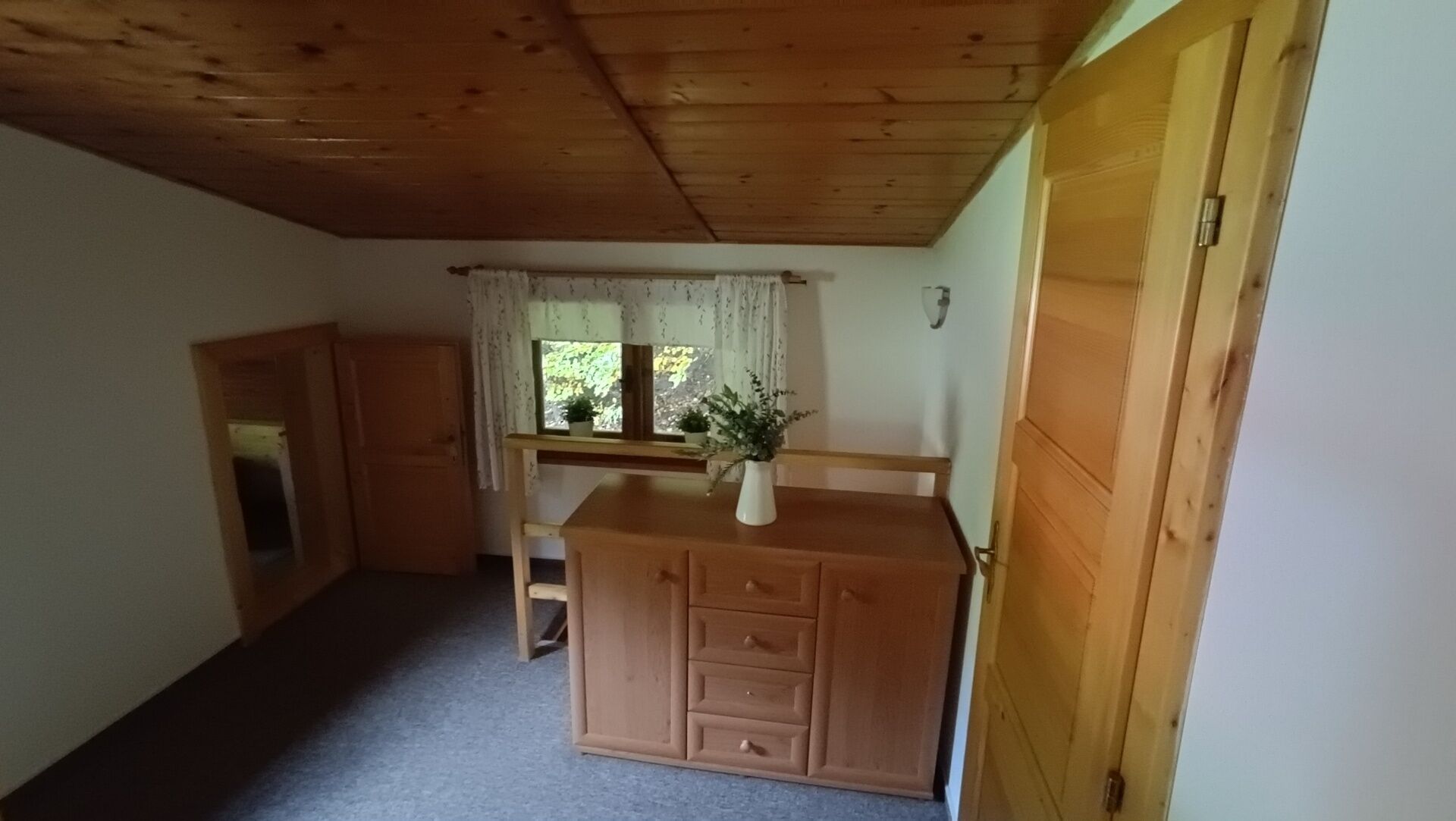 Dispoziční řešení: V 1.NP se nachází veranda, sklad nářadí, koupelna (se sprchovým koutem), WC, sauna (6-8 osob), obývací pokoj s vybavenou kuchyní (trouba se sklokeramickou deskou, lednicí, mikrovlnou troubou, varnou konvicí, toustovačem a vším potřebným nádobím) s jídelnou, která ji propojuje s obývacím pokojem s krbem. V obývacím pokoji jsou dvě prostorná rozkládací lůžka, TV, DVD přehrávač) a schodiště do podkroví. V podkroví: Předsíň, 4 x pokoj (8 lůžek).