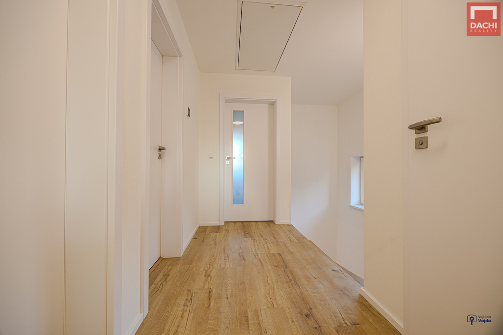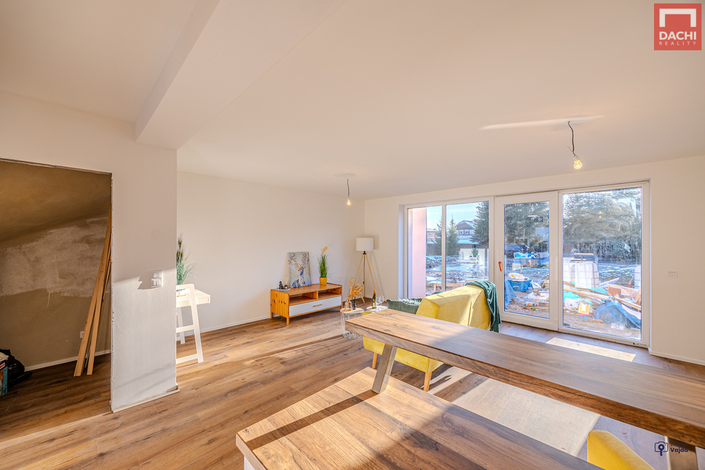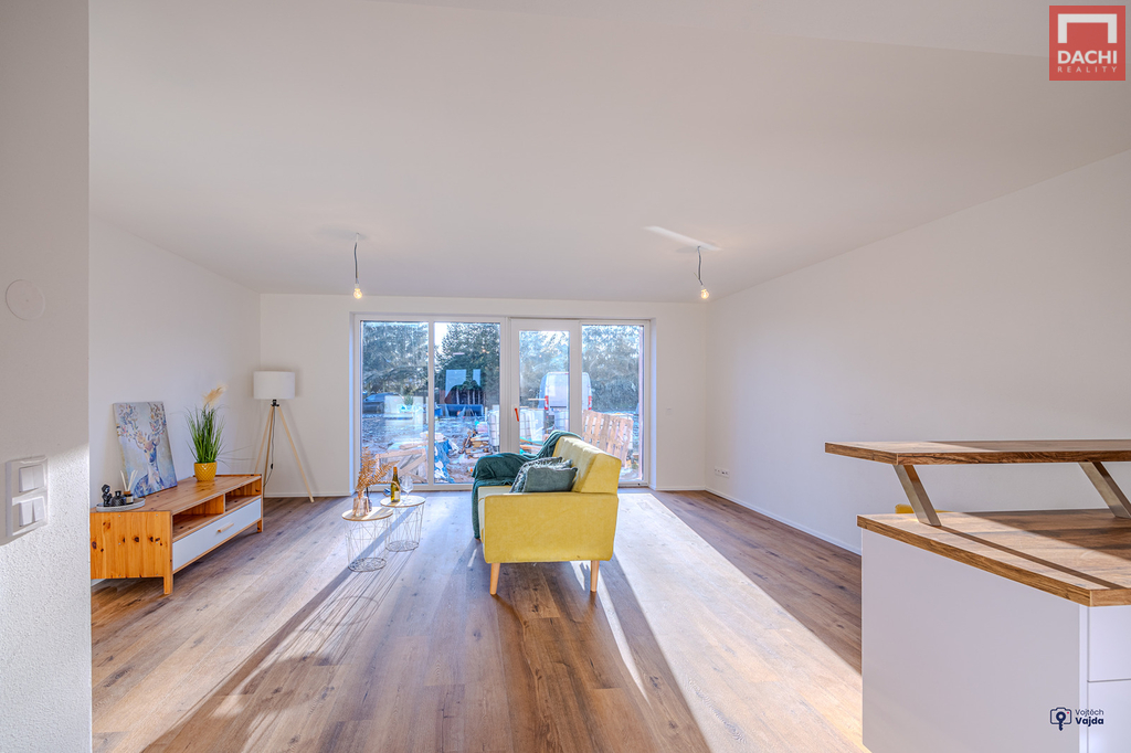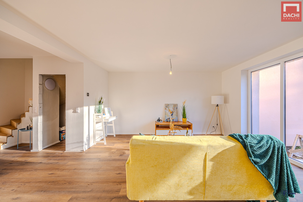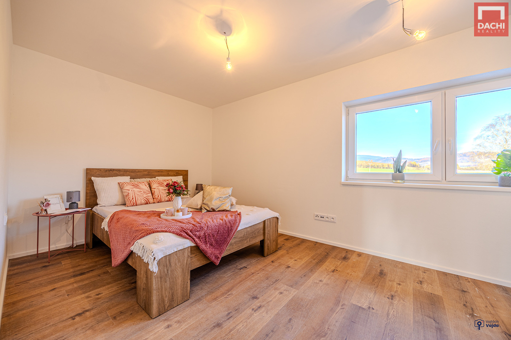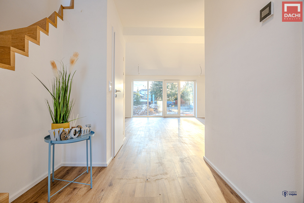 V přízemí domu najdeme velkorysou, prosvětlenou obývací zónu s kuch.koutem a jídelním koutem v budoucnu se vstupem na terasu nebo na zahradu. Dále je také v přízemí špajz, koupelna se sprchovým koutem a WC, technická místnost a praktická šatna. V 1. patře pak najdeme 2 samostatné neprůchozí pokoje, ložnici s pracovním koutem, relaxační koupelnu s vanou, samostatné WC. Možnosti rozšíření a zpřístupnění podkroví pro hernu, fitness nebo relaxační zónu. Podlahy budou pokryty vinylovou krytinou, která je nejen praktická, ale i estetická. Součástí kupní ceny je také kuchyňská linka včetně vestavěných spotřebičů, sanitární vybavení a obložkové dveře. V ceně je zahrnuto oplocení a zámková dlažba před domem. Nad rámec kupní ceny je možné dořešit pergolu, oplocení terasy, kryté parkovací stání pro auto, zabezpečovací systém, fotovoltaické panely s možností dotace nebo realizaci interiérů dle přání a nápadů budoucích majitelů. Dům je dokončený, zkolaudovaný a připravený k bydlení.