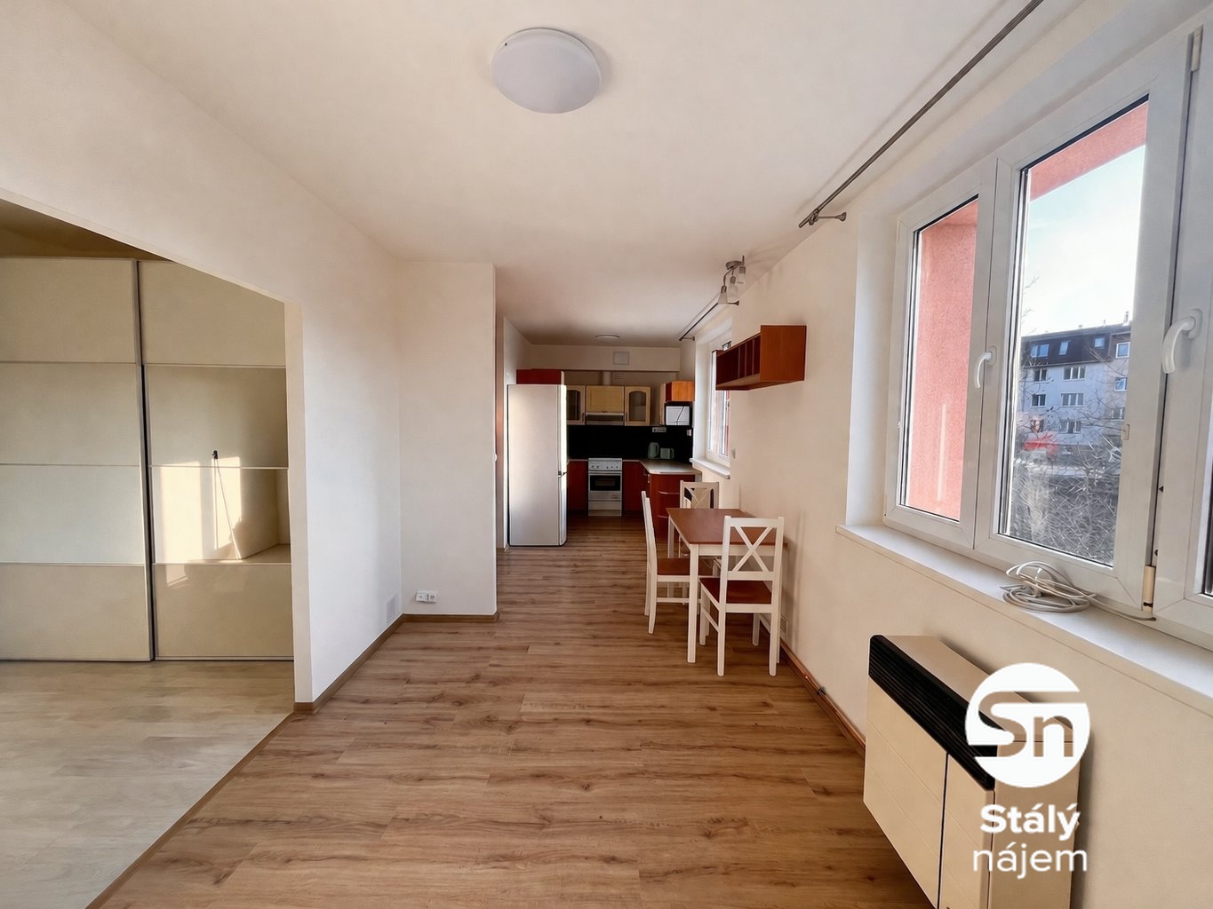 Interiér je prakticky řešen a zůstává vybaven vším, co vidíte na fotografiích. V kuchyňském koutě najdete linku s lednicí, mikrovlnnou troubou a digestoří, nechybí ani jídelní stůl se židlemi. Hlavní obytná část nabízí dostatek úložných prostor díky vestavěným skříním a k dispozici je také pračka.