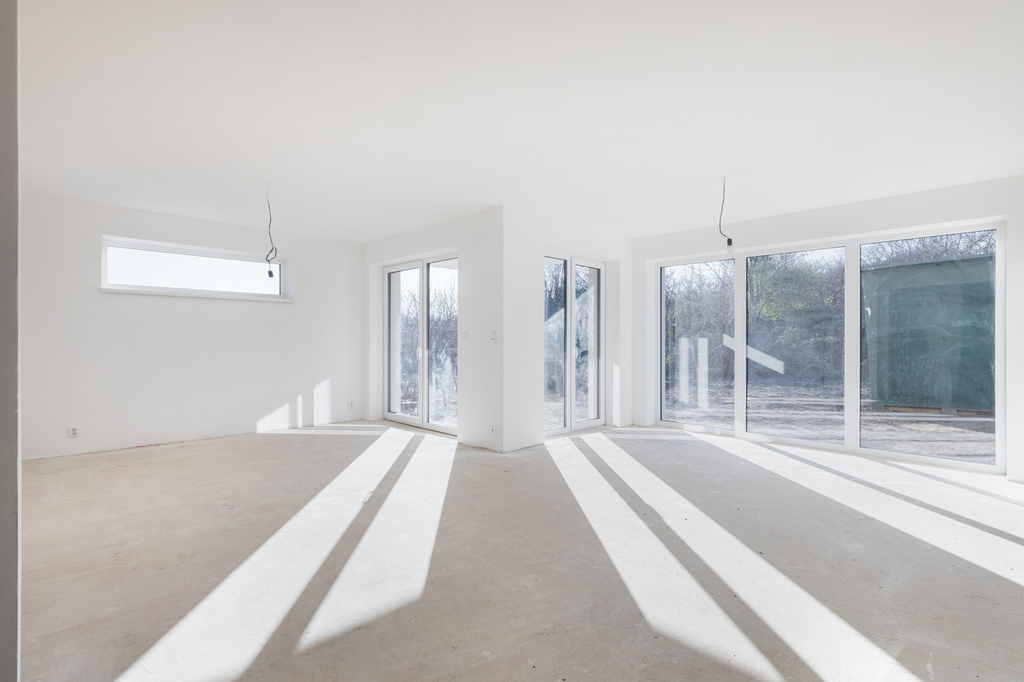 Velkorysý obývací prostor (cca 45 m²) s přípravou na krb a přímým vstupem na jižně orientovanou terasu