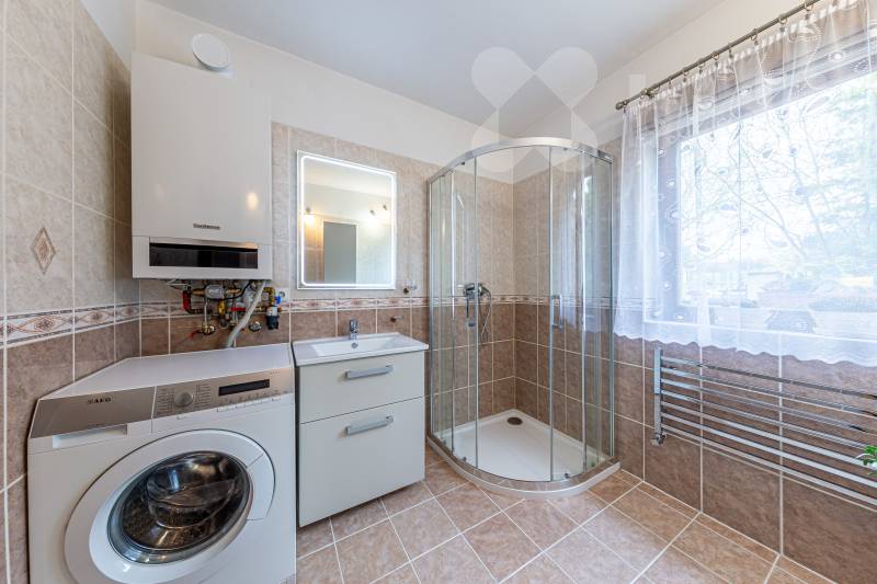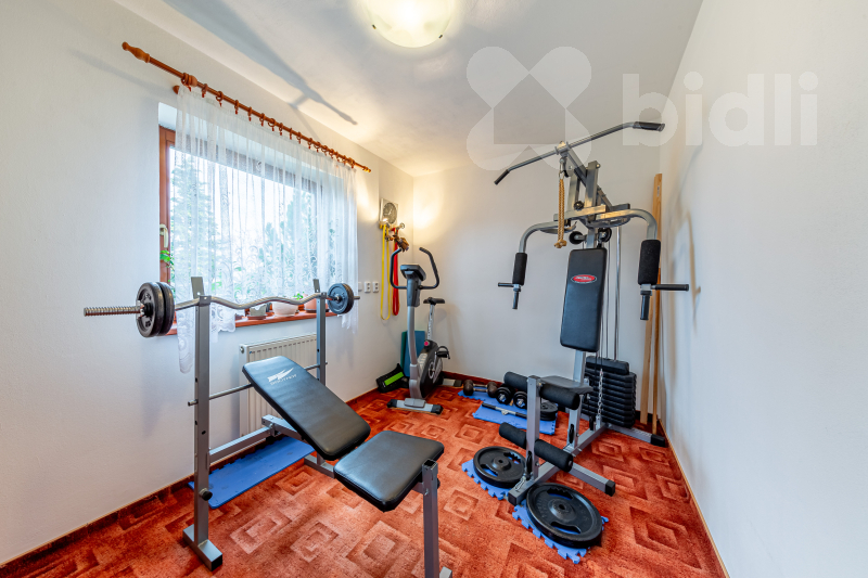 V přízemí se nachází světlý obytný prostor s kuchyňským koutem, samostatná jídelna, koupelna se sprchovým koutem, oddělené WC a praktická místnost využívaná jako posilovna. Velkou výhodou je také přímý vstup do garáže suchou nohou.