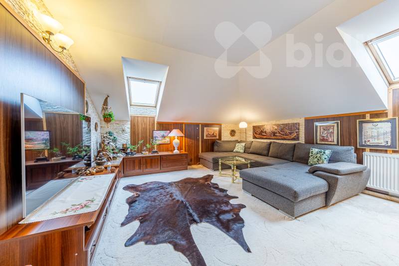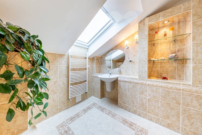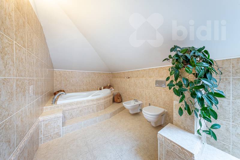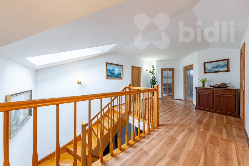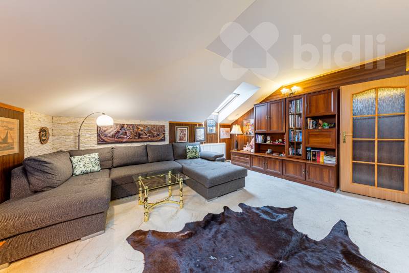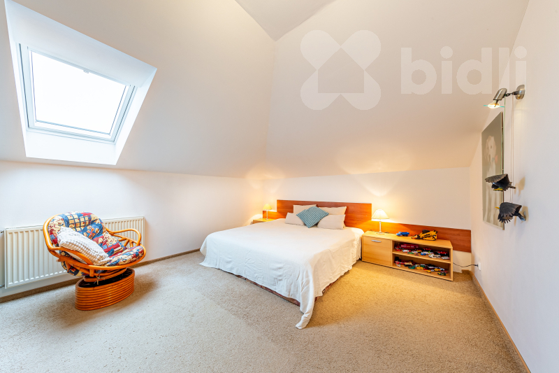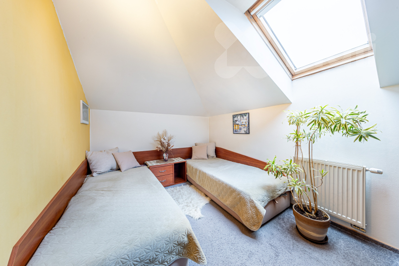 V patře najdete druhý obývací pokoj, který poskytuje další komfortní prostor pro odpočinek či zábavu, dále hlavní ložnici, šatnu, dětský pokoj a dva samostatné pokoje. Nechybí ani prostorná koupelna s vanou a toaletou.