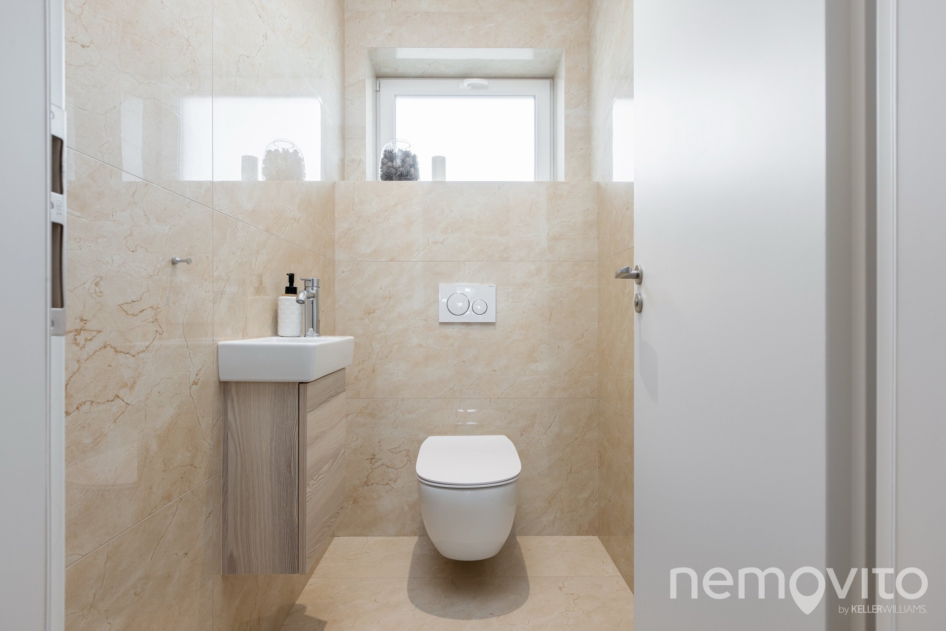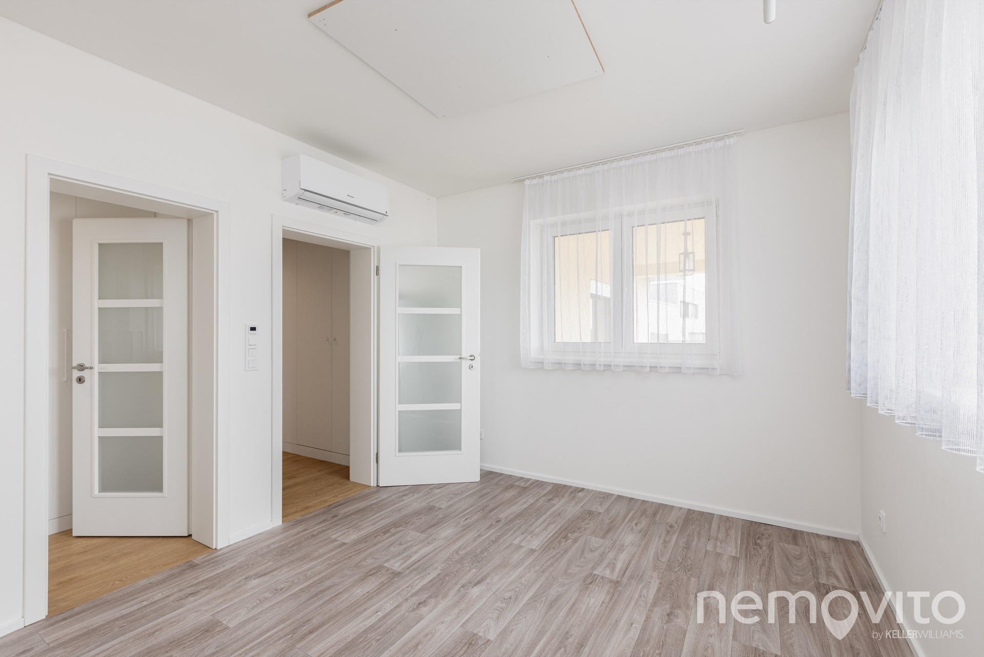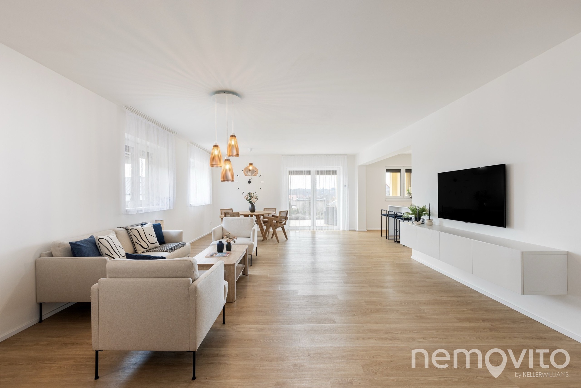 Obývací pokoj s kuchyňským koutem má nadstandardní velikost 55 m2. Ke kuchyni patří ještě velká komora (8 m2) a na obývák navazuje oddělená část, která funguje jako 15 m2 pracovna. Skutečně velkorysé pojetí, kde je na všechno dost místa, ale při zachování nízkých provozních nákladů. Interiér je laděn do světlých a jemných tónů a je klimatizován.