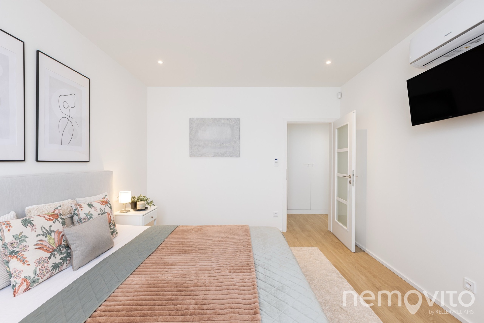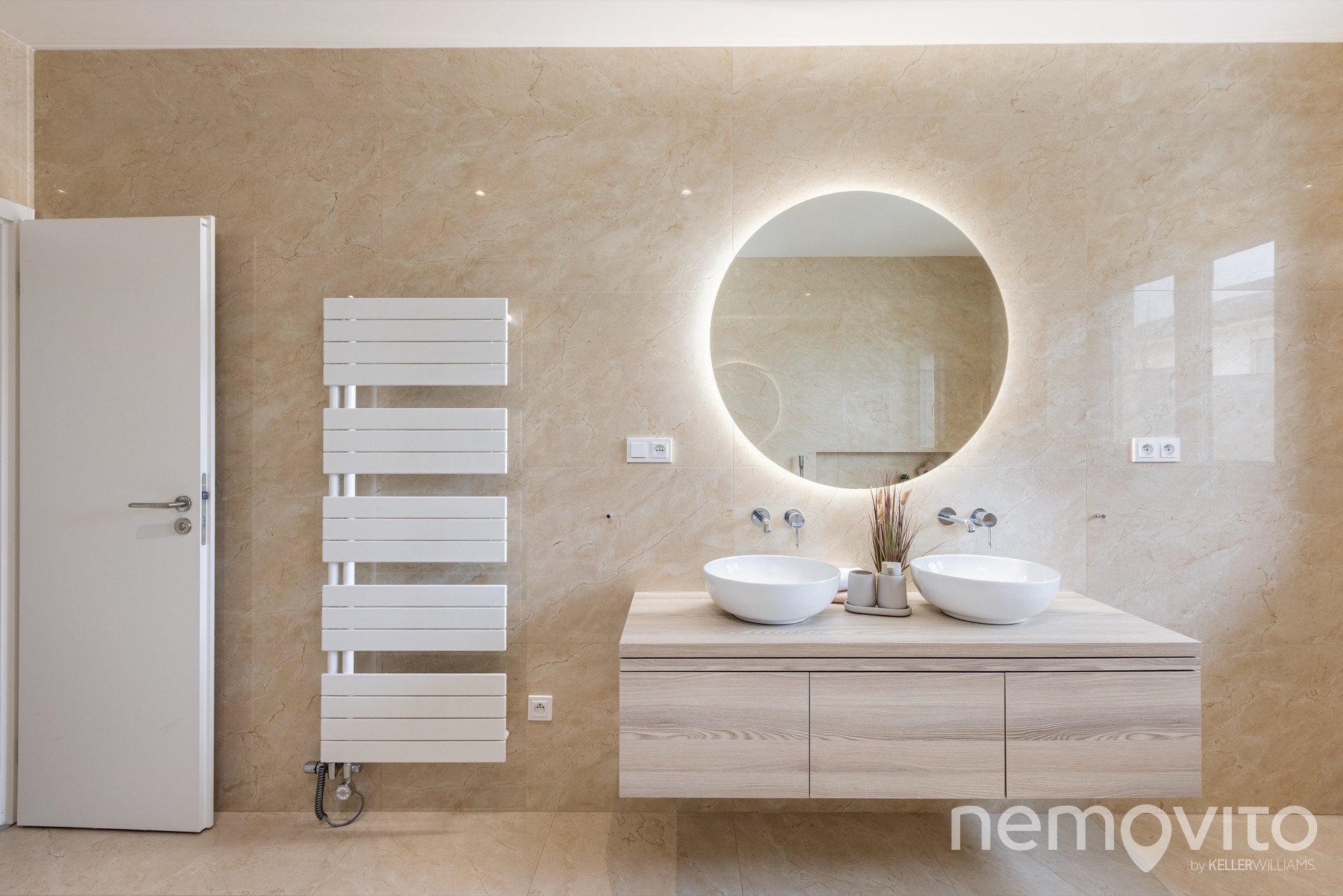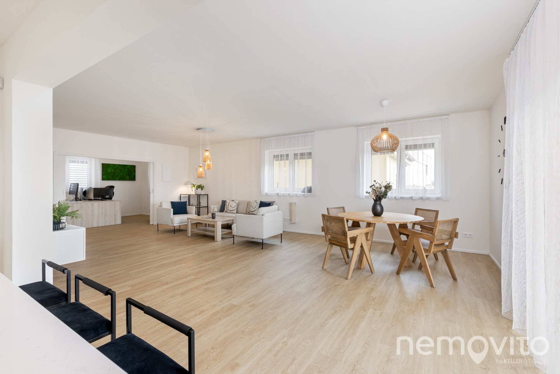 Obývací pokoj s kuchyňským koutem má nadstandardní velikost 55 m2. Ke kuchyni patří ještě velká komora (8 m2) a na obývák navazuje oddělená část, která funguje jako 15 m2 pracovna. Skutečně velkorysé pojetí, kde je na všechno dost místa, ale při zachování nízkých provozních nákladů. Interiér je laděn do světlých a jemných tónů a je klimatizován.