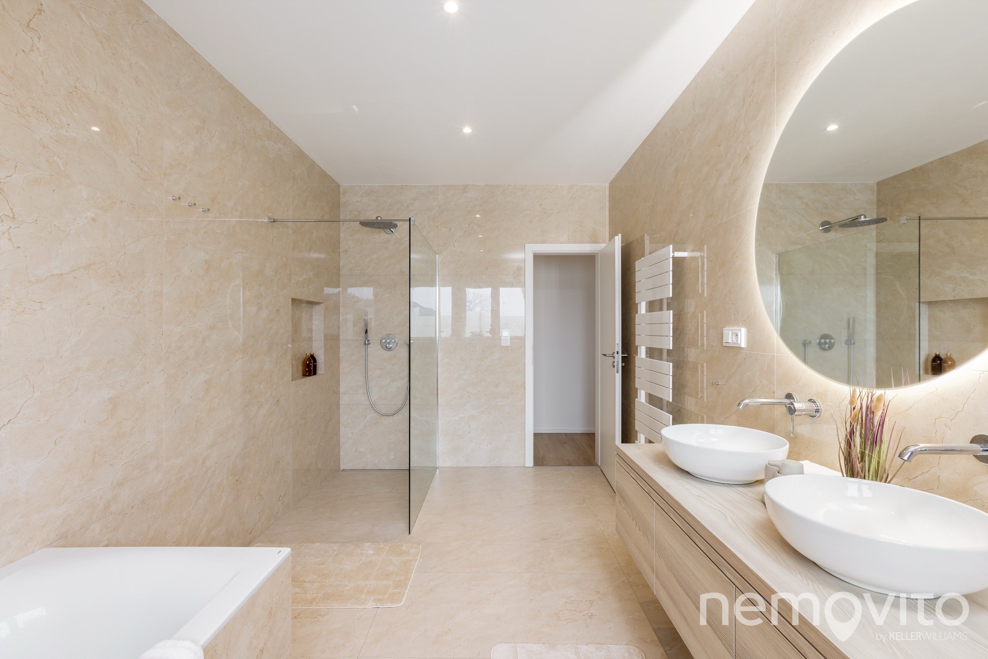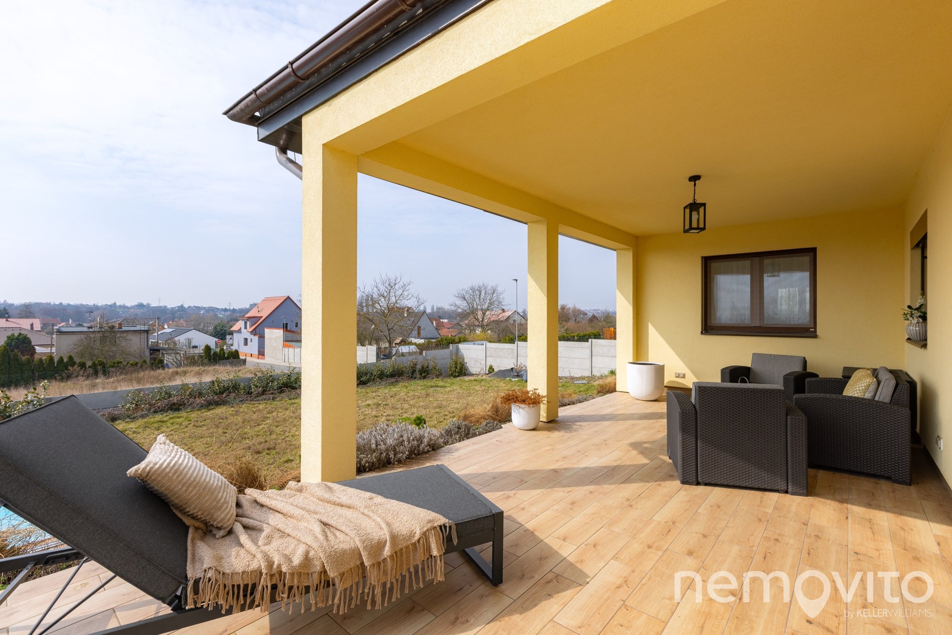 Z obýváku je výstup na krytou terasu, která je začleněna do půdorysu domu. Orientace je na jihozápad, kde je zároveň umístěn bazén s technologií. Na oknech jsou nainstalované stínící žaluzie. Všechny 3 ložnice, které jsou v řadě za sebou, jsou dostatečně prostorné (2x 16 m2 a 14 m2 + 11 m2 šatna) a přístupné z chodby, na které je velká vestavěná skříň. Koupelna o ploše 14 m2 je velká jako pokoj a je vybavena vanou, WC je samostatně.