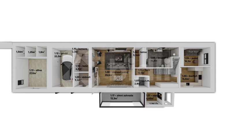 Dům je navržen pro dvougenerační bydlení, což znamená dvě samostatné bytové jednotky o dispozici 4+1. První jednotka nabízí pohodlí dvou koupelen a dvou šaten, které zajistí dostatek úložného prostoru. Druhá jednotka se pyšní terasou s výhledem do zahrady, garáží a dokonce ateliérem či dílnou - ideální pro vaše koníčky nebo práci z domova.