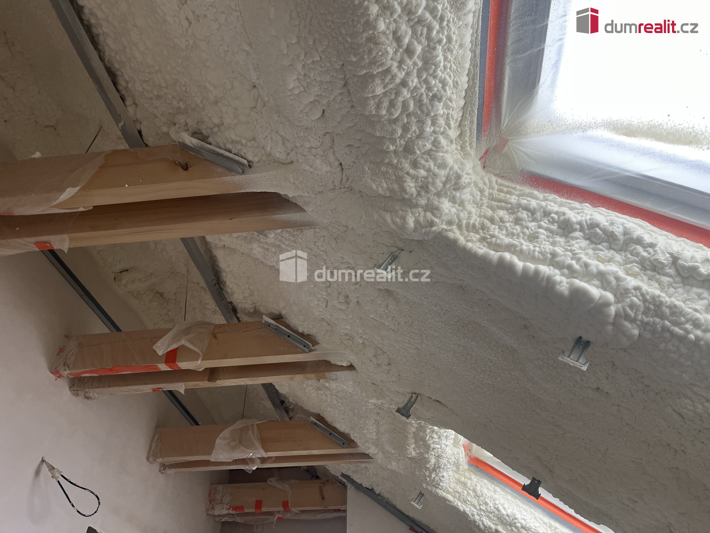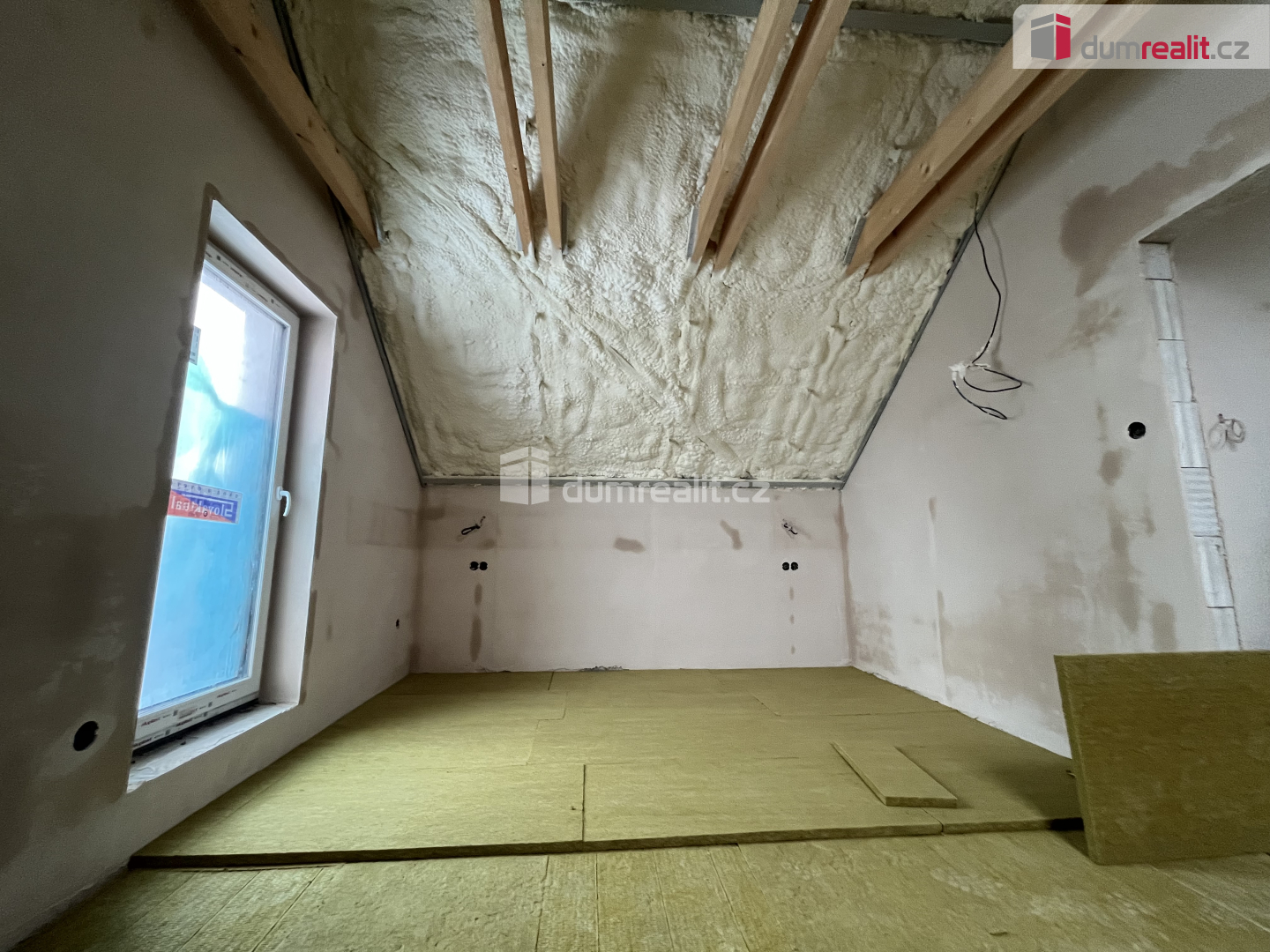 V patře domu, pod střechou (stříkaná izolace) jsou dva velké pokoje, další koupelna, toaleta a šatna.