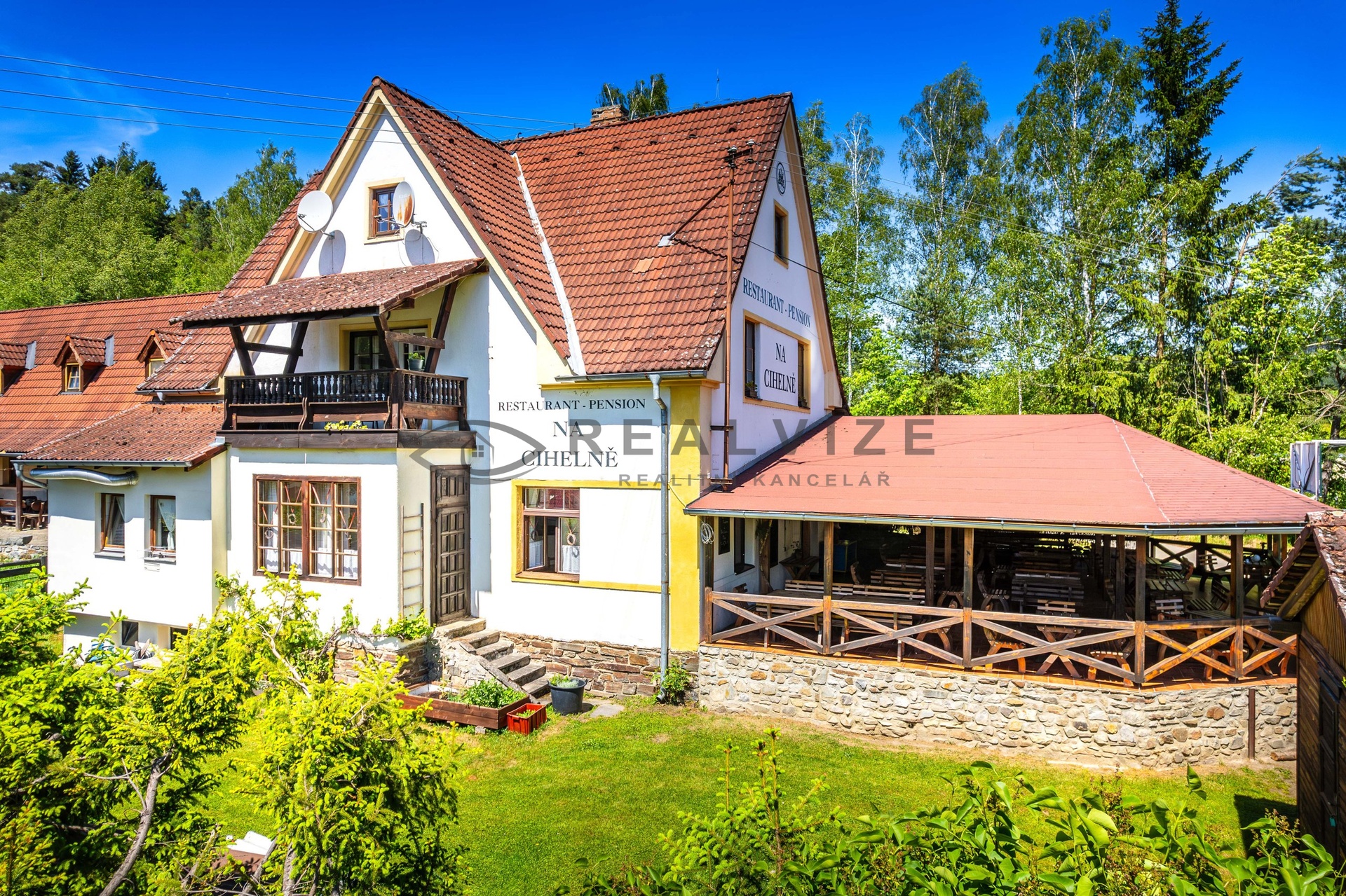 - Prostorná krytá terasa s venkovním krbem (cca 70 míst)