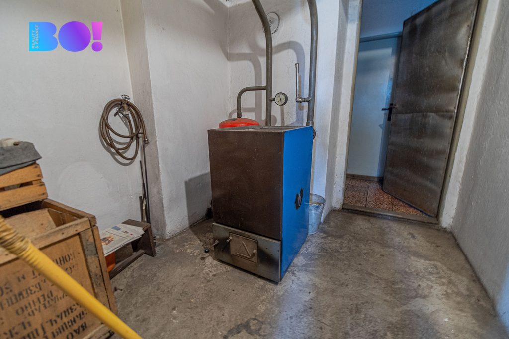 Součástí bytu jsou také dva prostorné sklepy o celkové výměře 28 m², z nichž jeden slouží jako kotelna – byt je vytápěn kotlem na tuhá paliva. V domě je již přiveden plyn, takže je zde možnost jednoduché instalace plynového kotle pro pohodlnější vytápění. Dále je možnost si vybudovat v bytě krbové kamna.