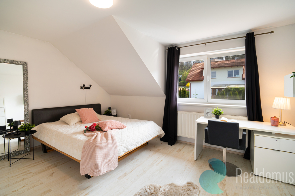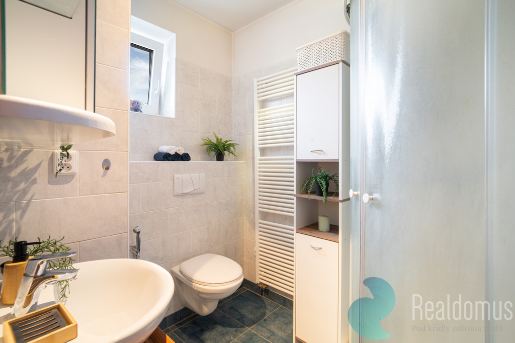 V přízemí se dále nachází koupelna se sprchovým koutem a toaletou, praktická komora pod schodištěm a ložnice s vestavěnou skříní a přímým vstupem na terasu.